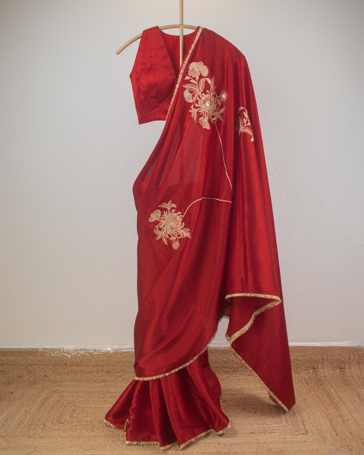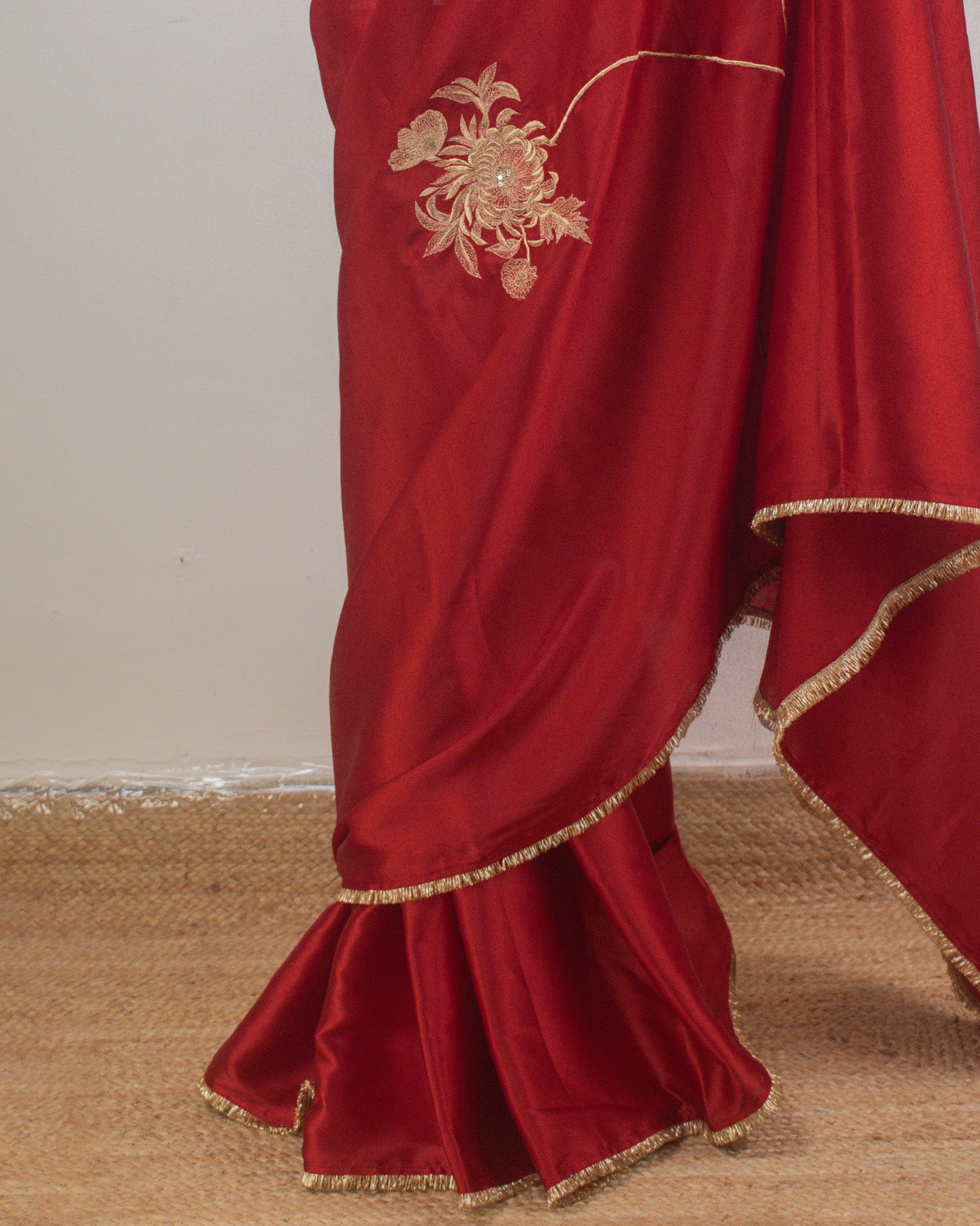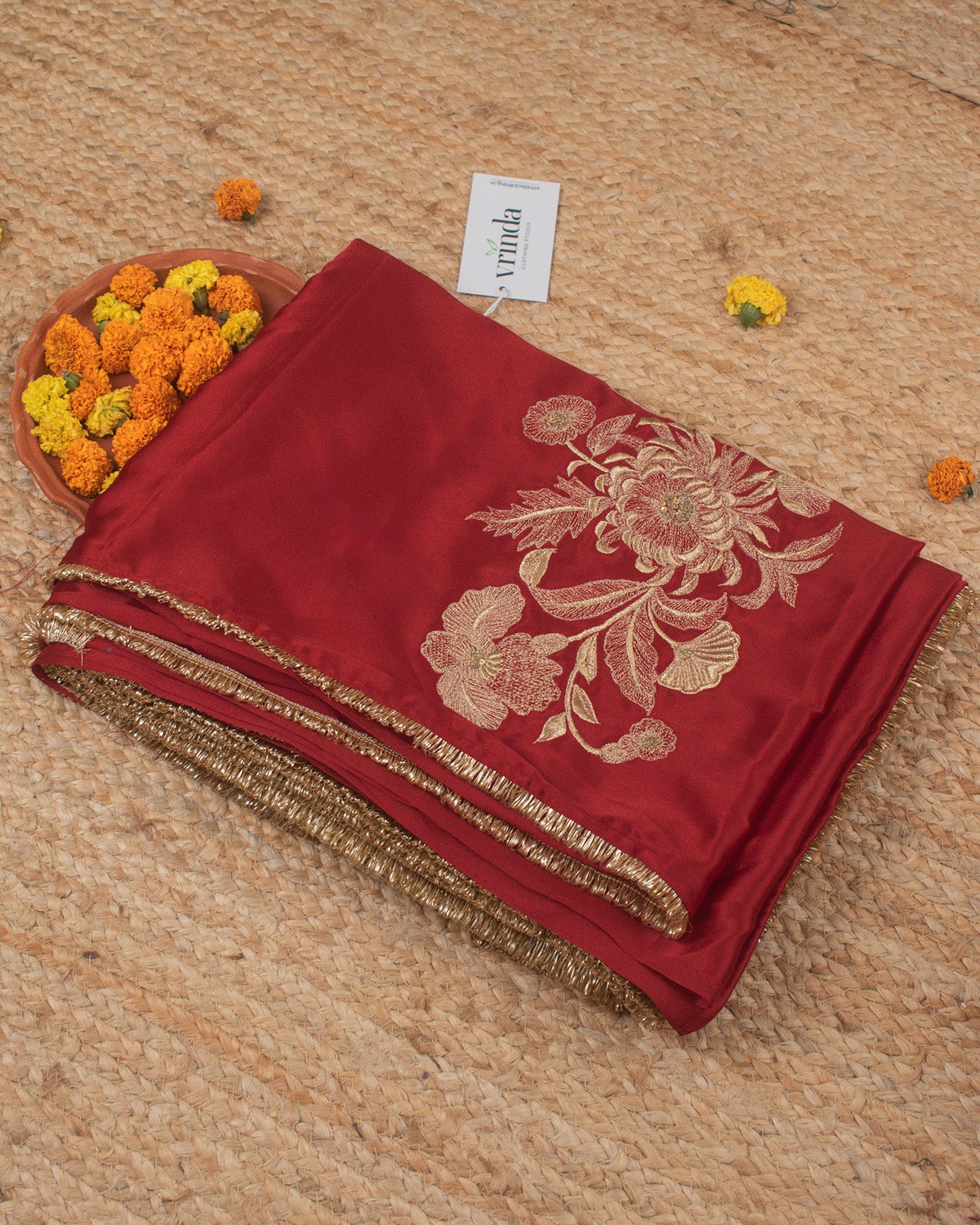 This stunning Red Satin Silk Saree features a smooth, buttery feel, decorated with delicate hand-embroidered floral designs and charming gotta fringe edges . Perfect for turning heads, it promises to brighten any occasion with its graceful charm.