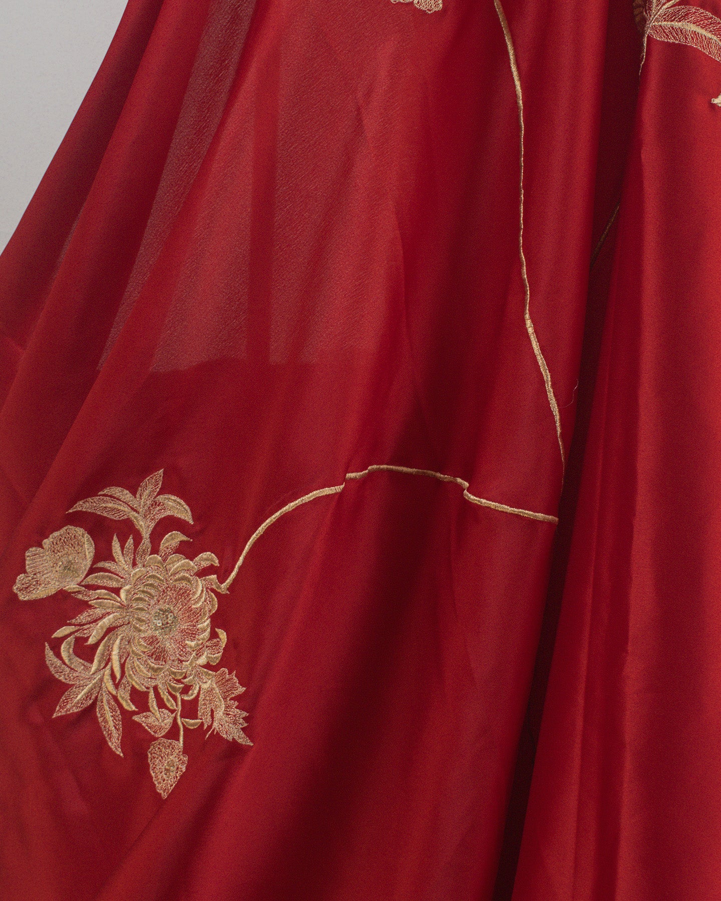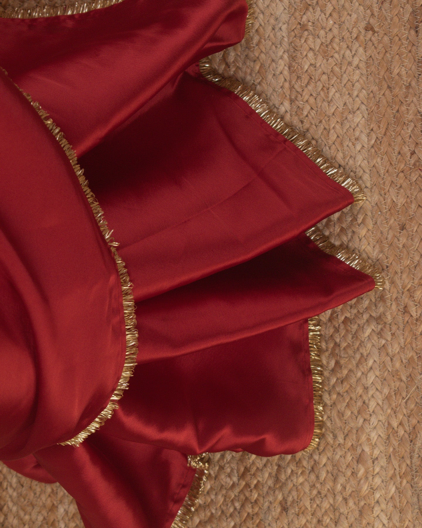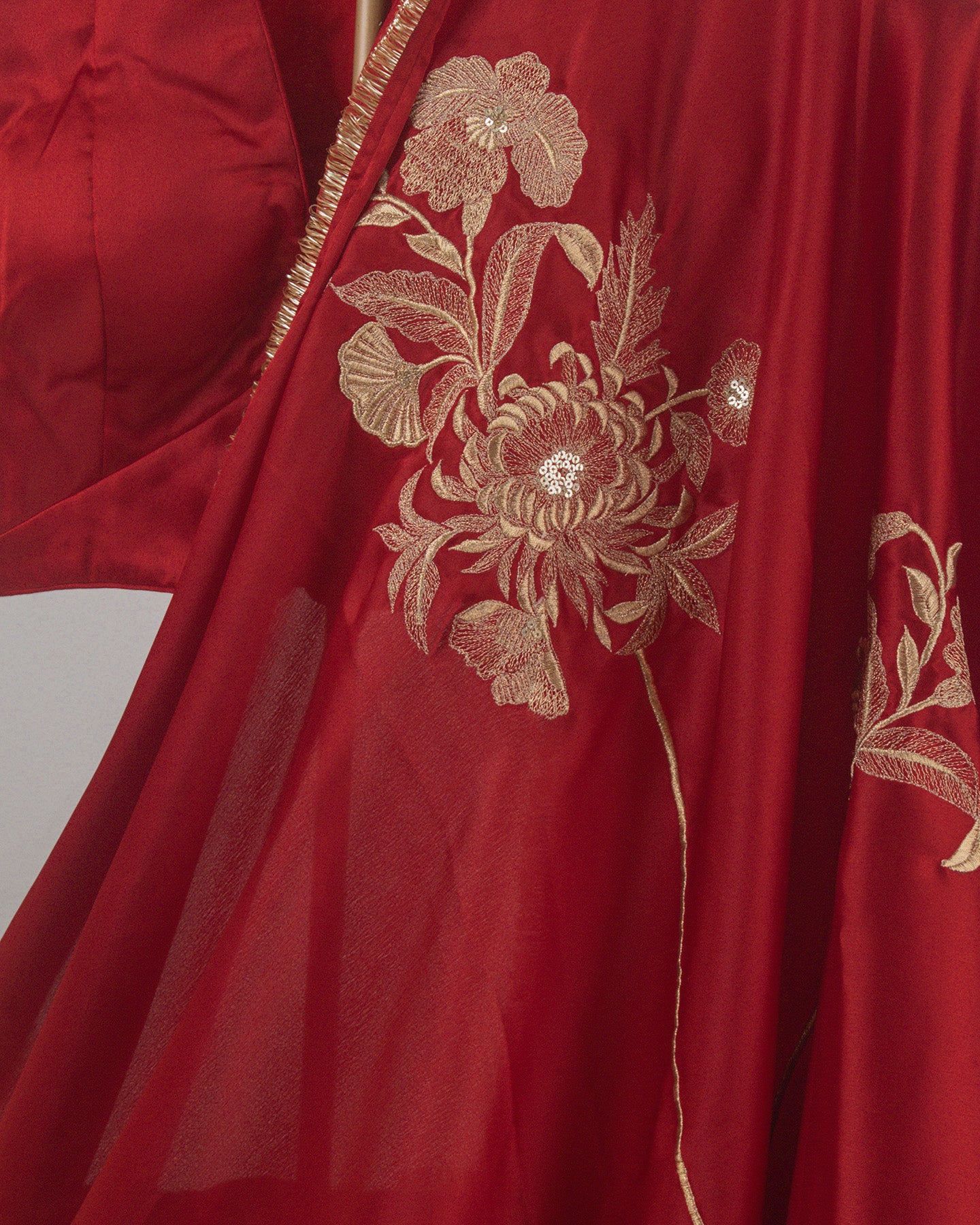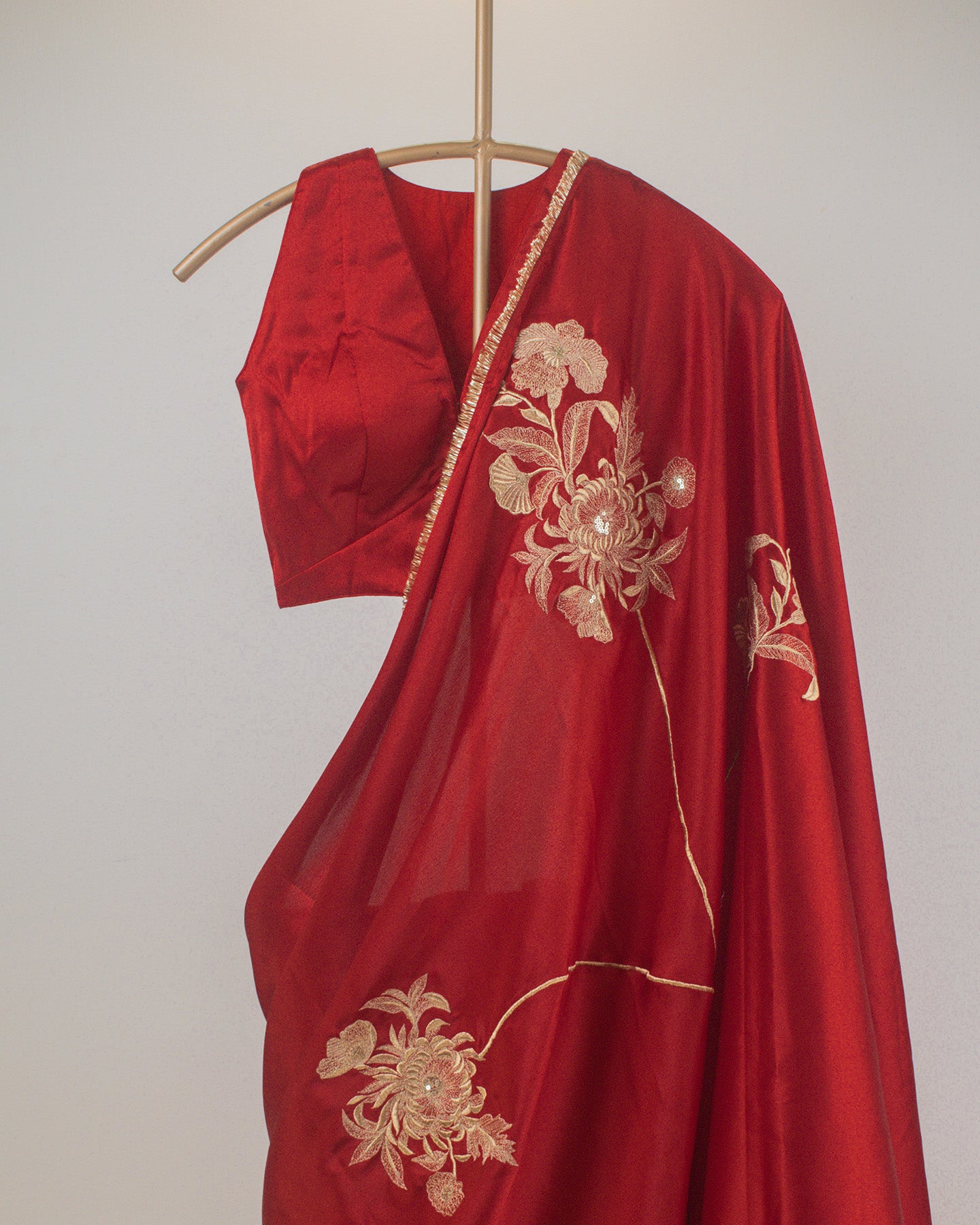 This stunning Red Satin Silk Saree features a smooth, buttery feel, decorated with delicate hand-embroidered floral designs and charming gotta fringe edges . Perfect for turning heads, it promises to brighten any occasion with its graceful charm.