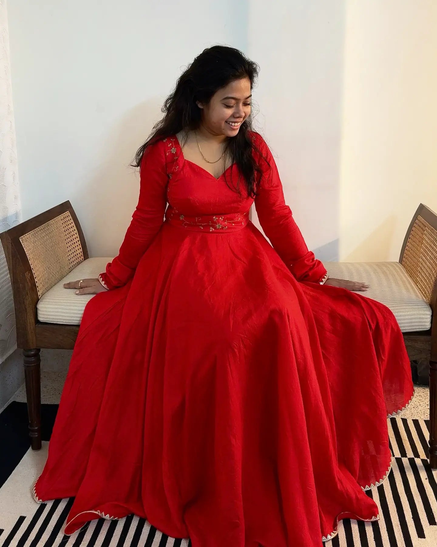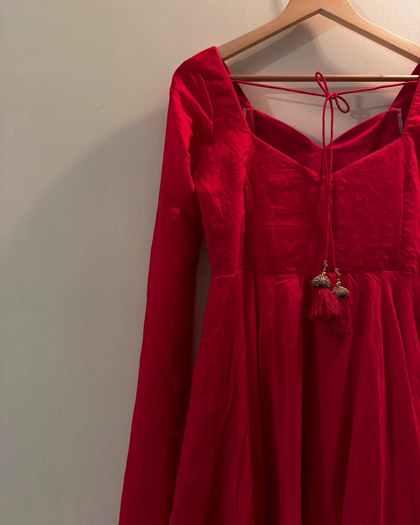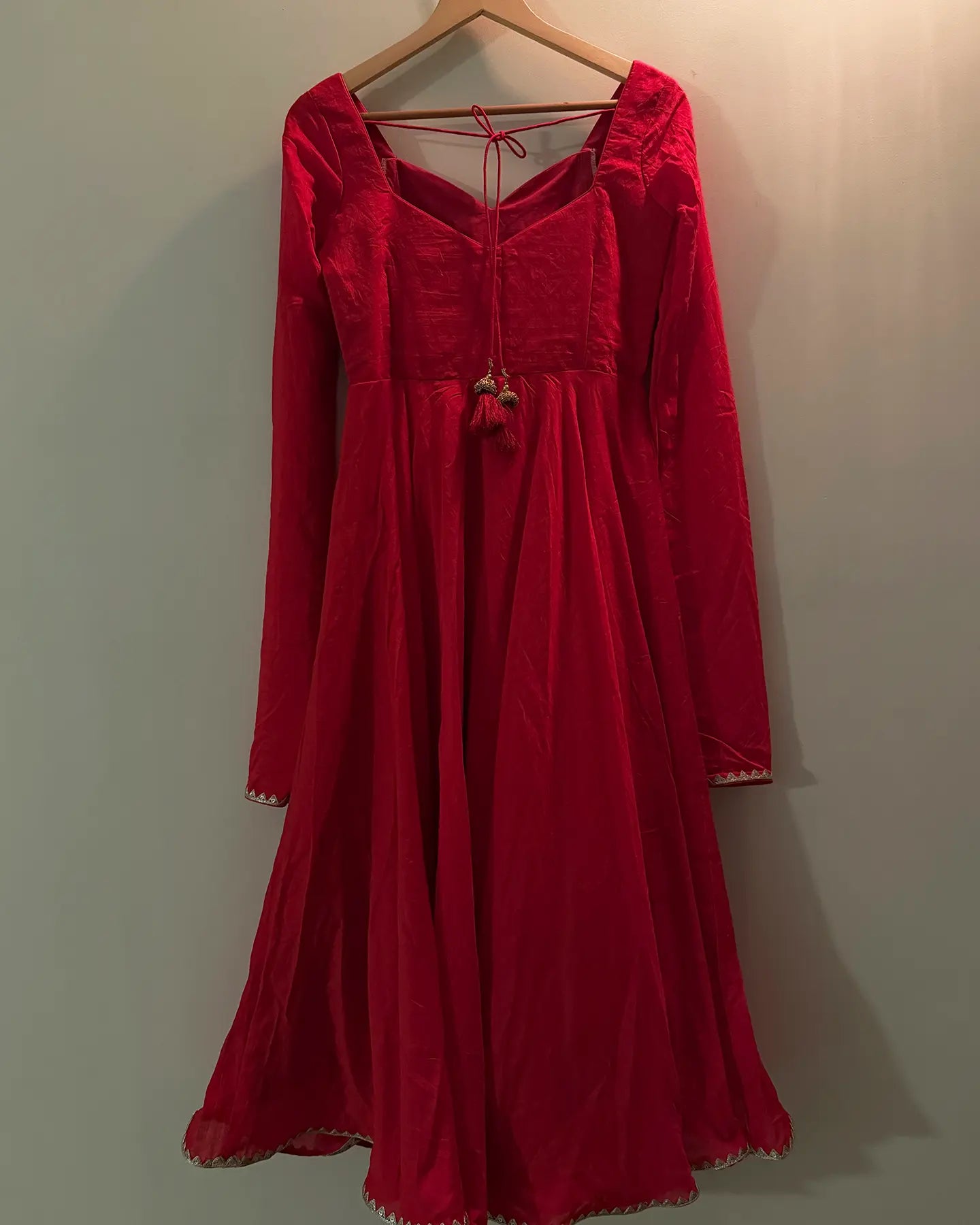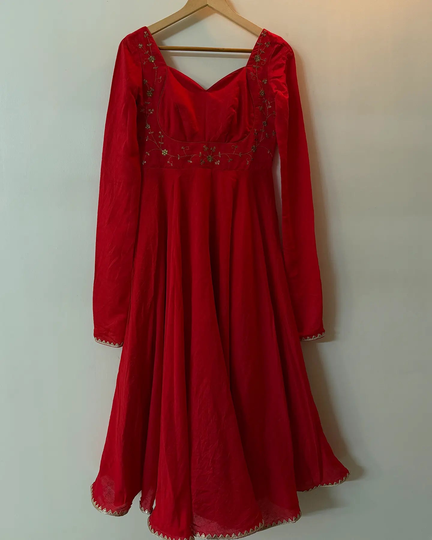 Style: flared Anarkali with long churidaar sleeves. Length 48-50 inches.