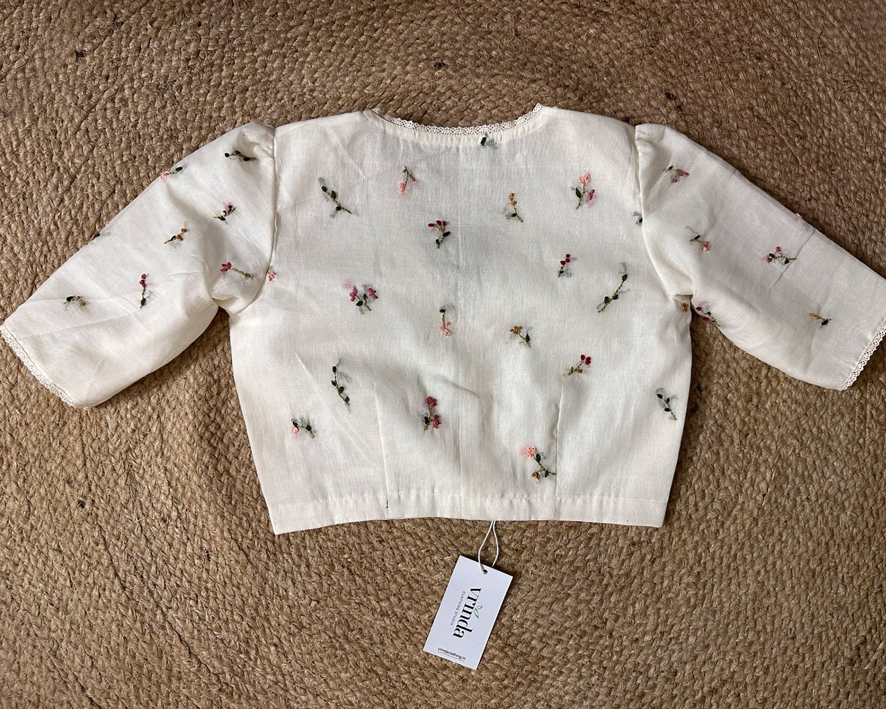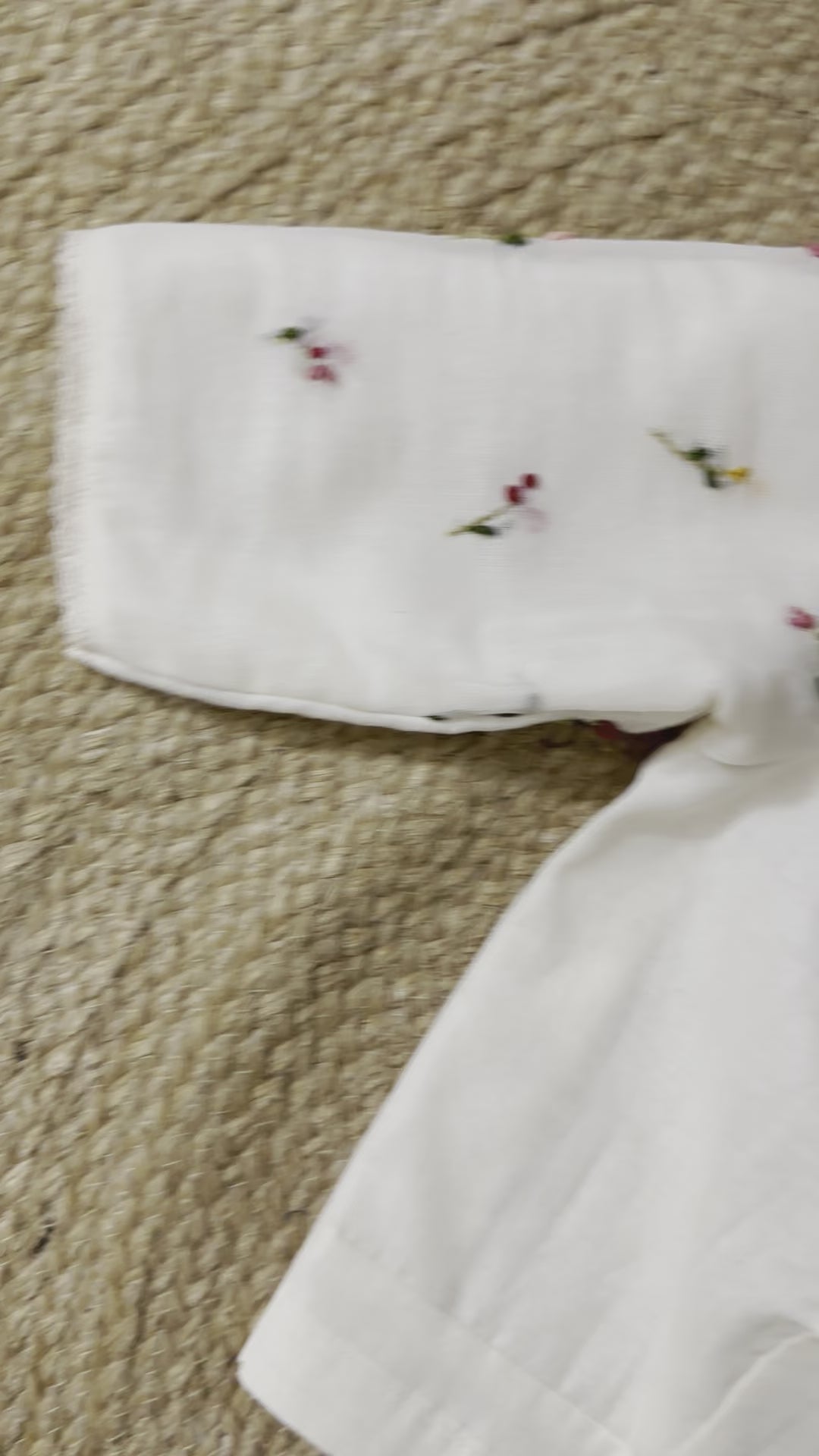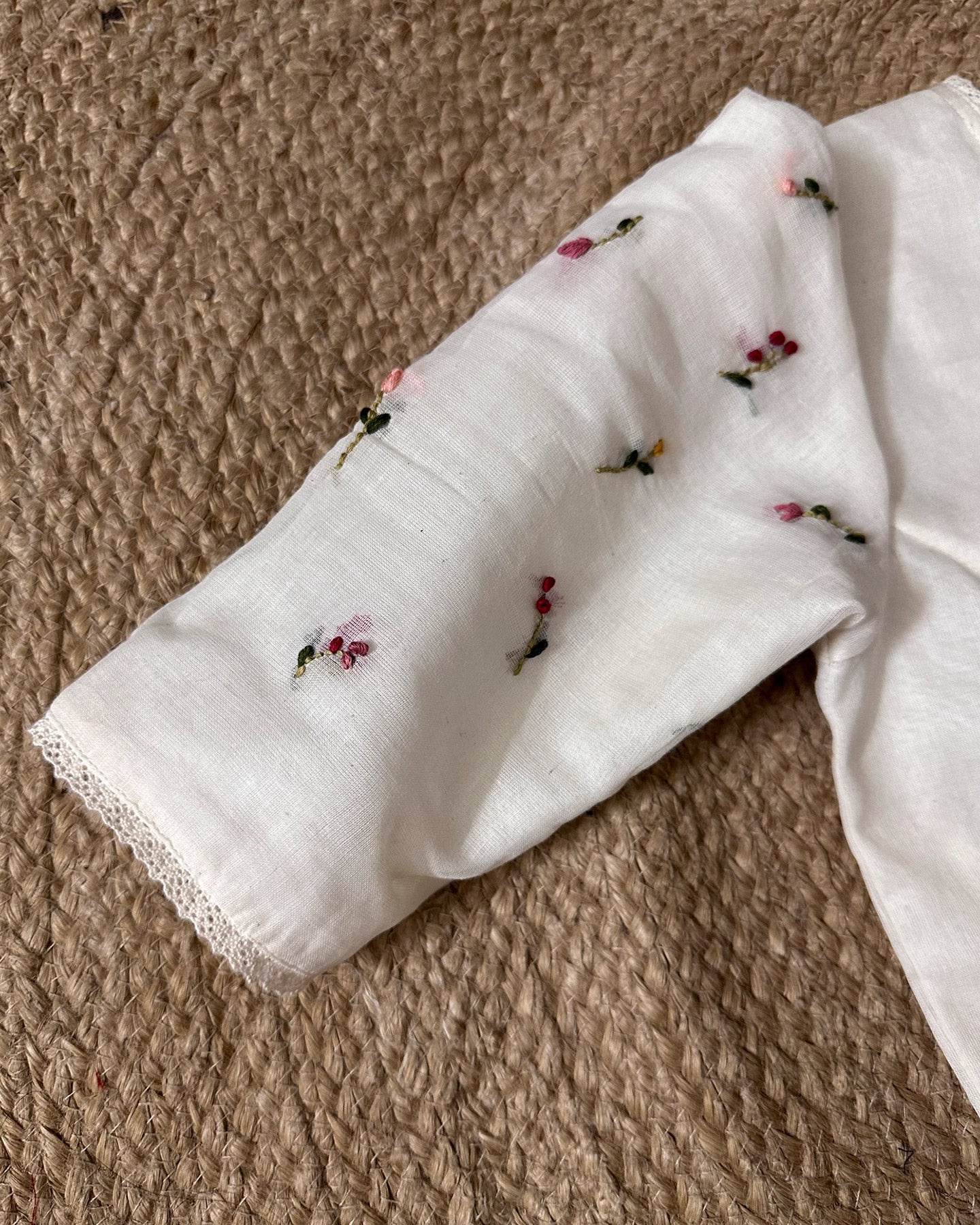Made in dreamy pure mulmul cotton with minute embroidered flowers and accompanied with sober ivory lace neckline. Fully lined on body and sleeves.