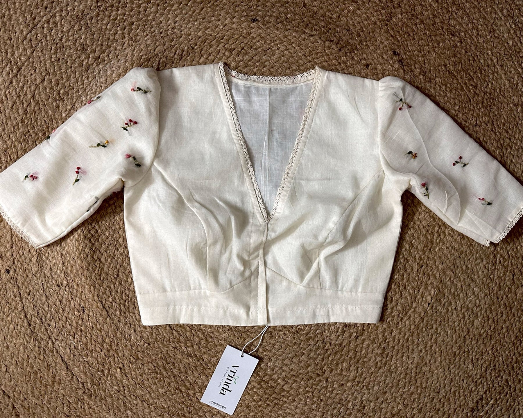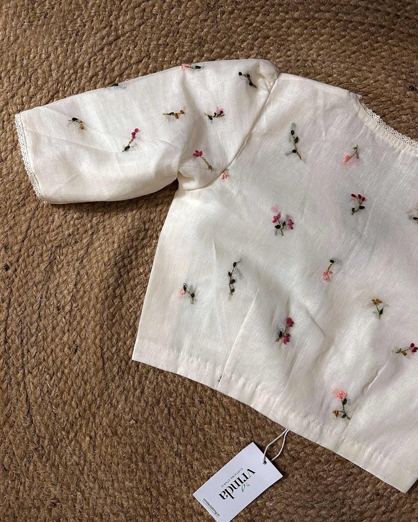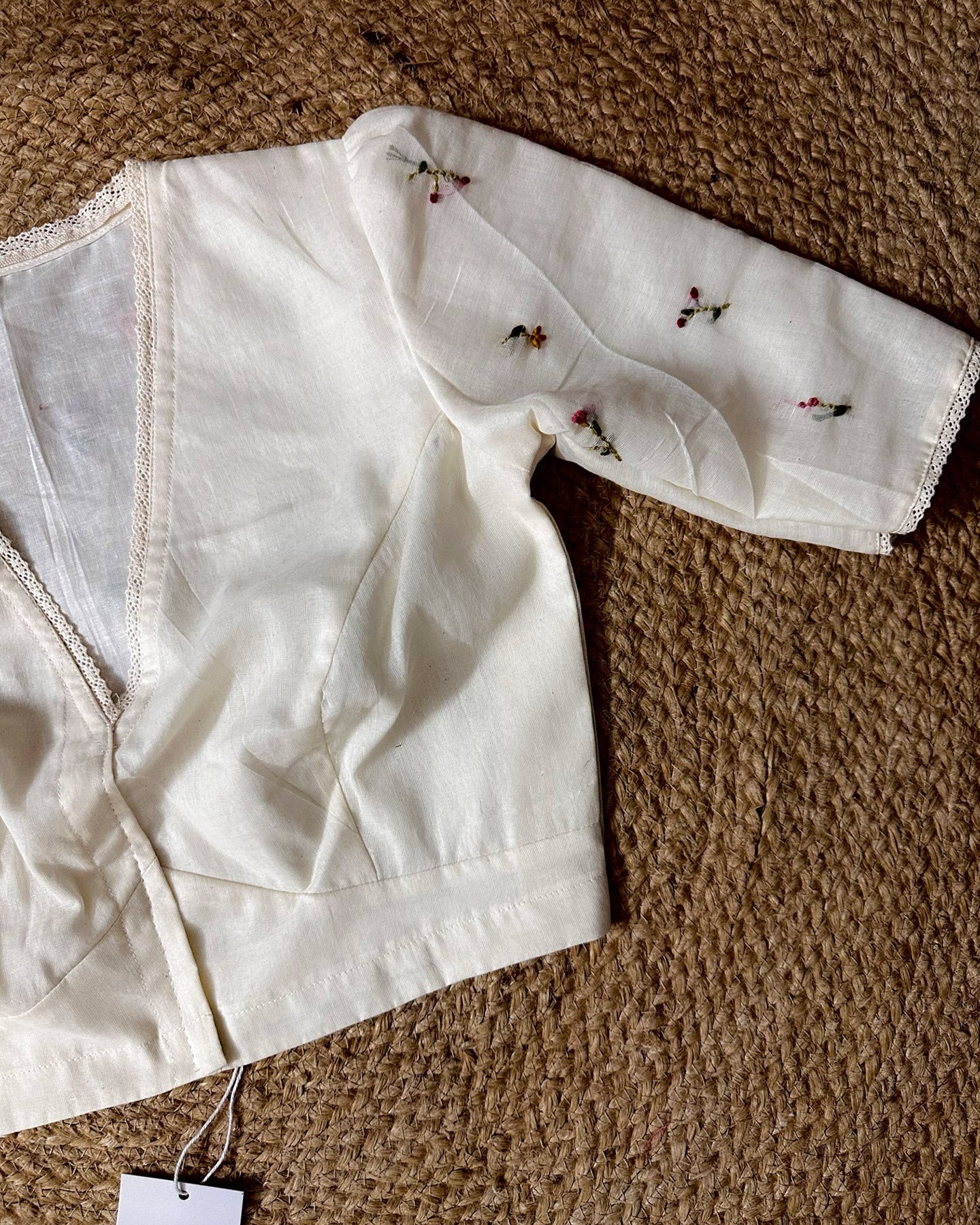 Made in dreamy pure mulmul cotton with minute embroidered flowers and accompanied with sober ivory lace neckline. Fully lined on body and sleeves.