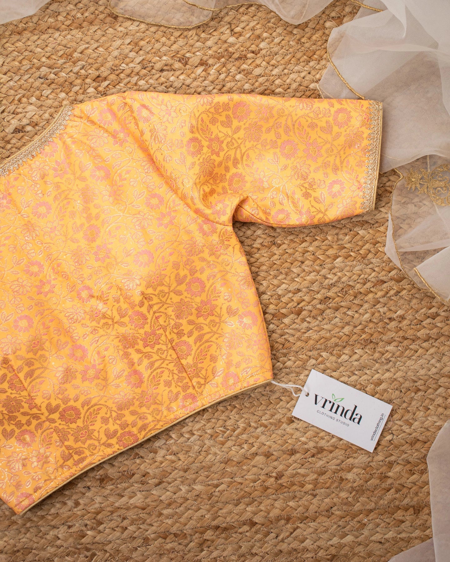 Made just for you, this elegant sunset yellow Varanasi brocade silk blouse with lovely lace borders is sure to make you shine and earn you endless compliments..