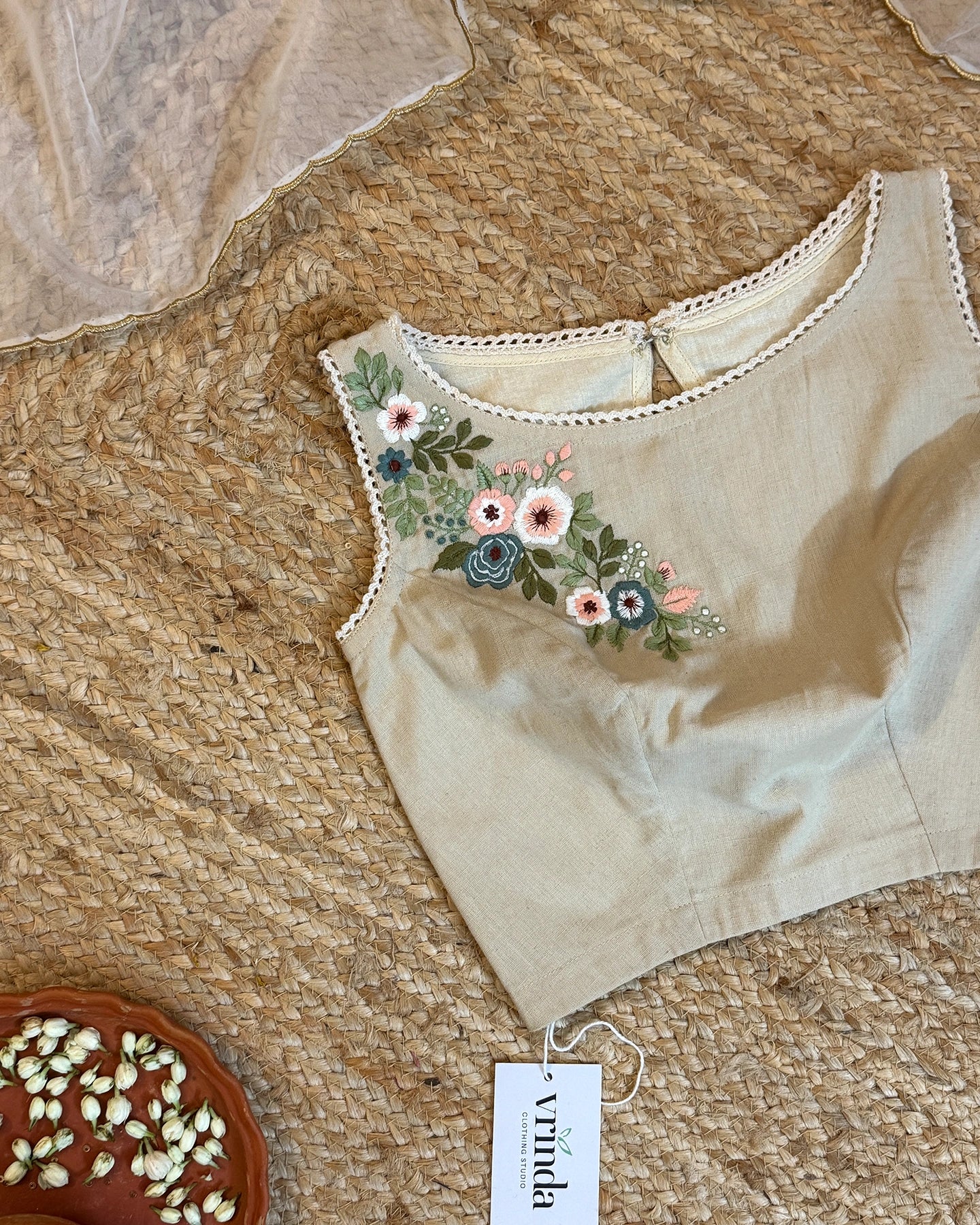 Classic everyday blouse, beautiful floral embroidery on the right side of the neck line, also accessorised with crochet Lace. Made of pure cotton lining inside, it's simple yet elegant addition for your wardrobe.