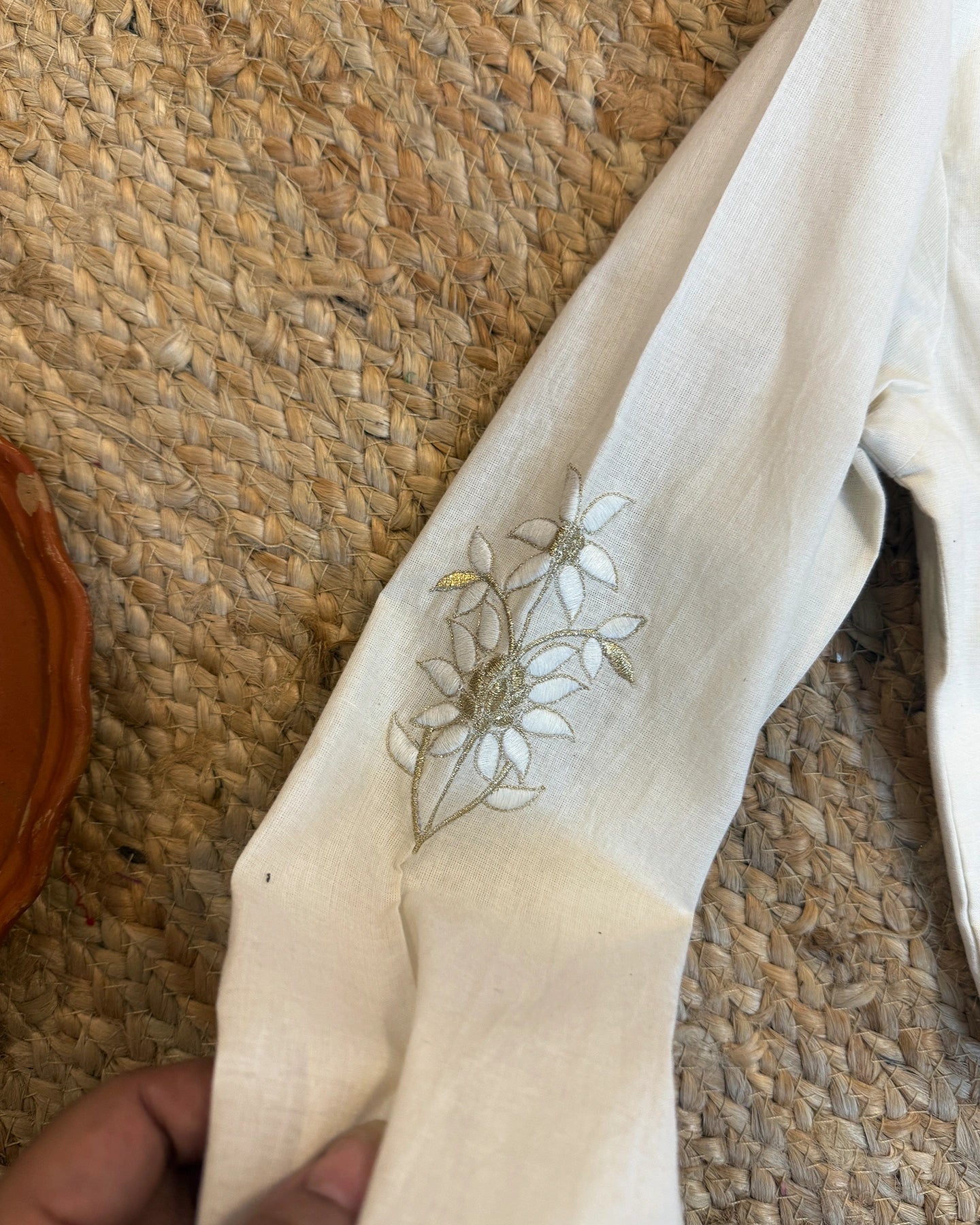 Another charming hand embroidered piece in pure ivory cotton features ancient era angrakha style in full sleeves for the regal and classic styling. Pair with endless type of sarees .