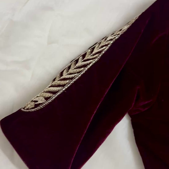 Prime your look with this soft velvet beauty. A versatile piece made in velvet with hand embroidery work for the best look and feel of elegance and Royal charm . This is a jacket or over coat style blouse which can be styled over anything sleeveless or strappy outfit.
