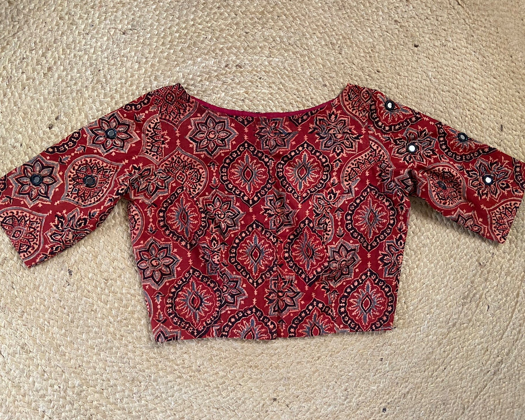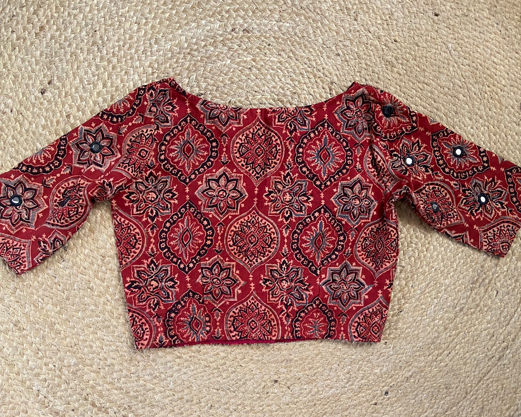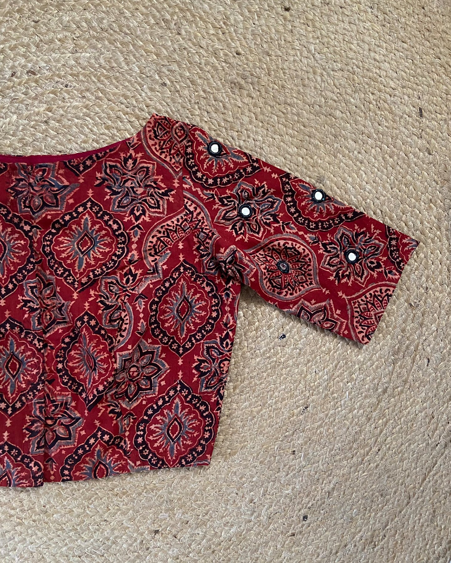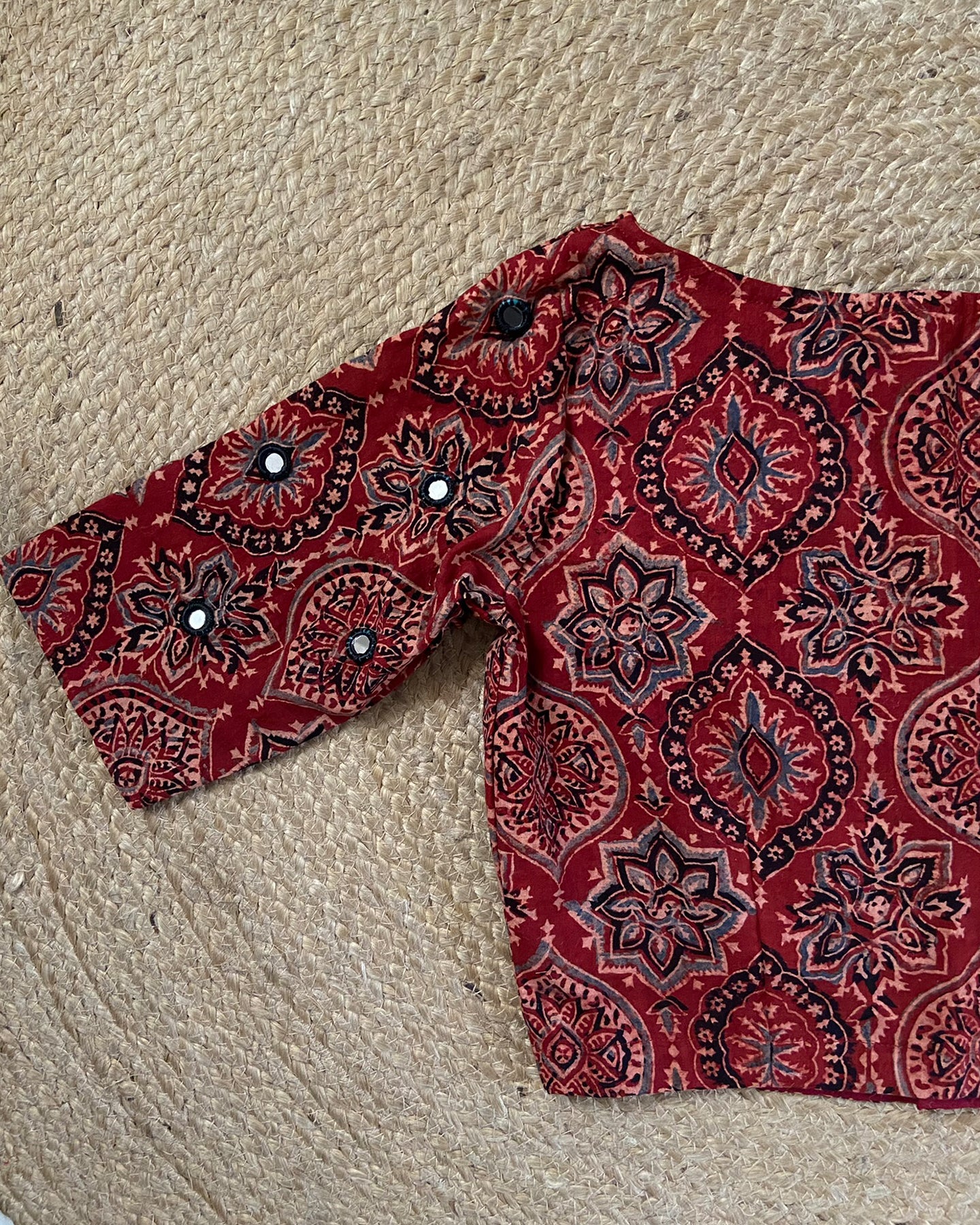 Black has been so loved that we thought to bring the red. Pure cotton hand-blocked ajrakh with beautiful mirror work on sleeves.