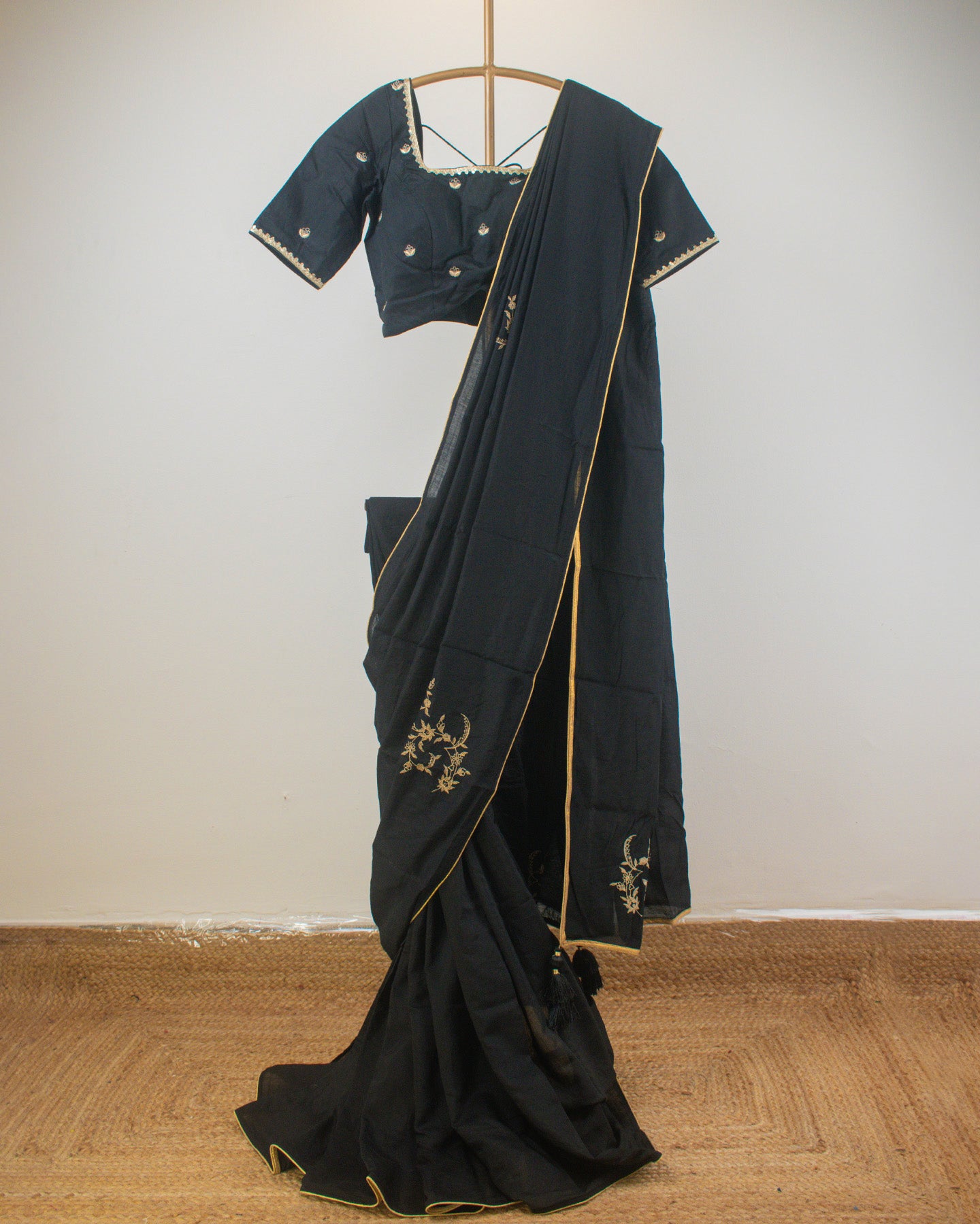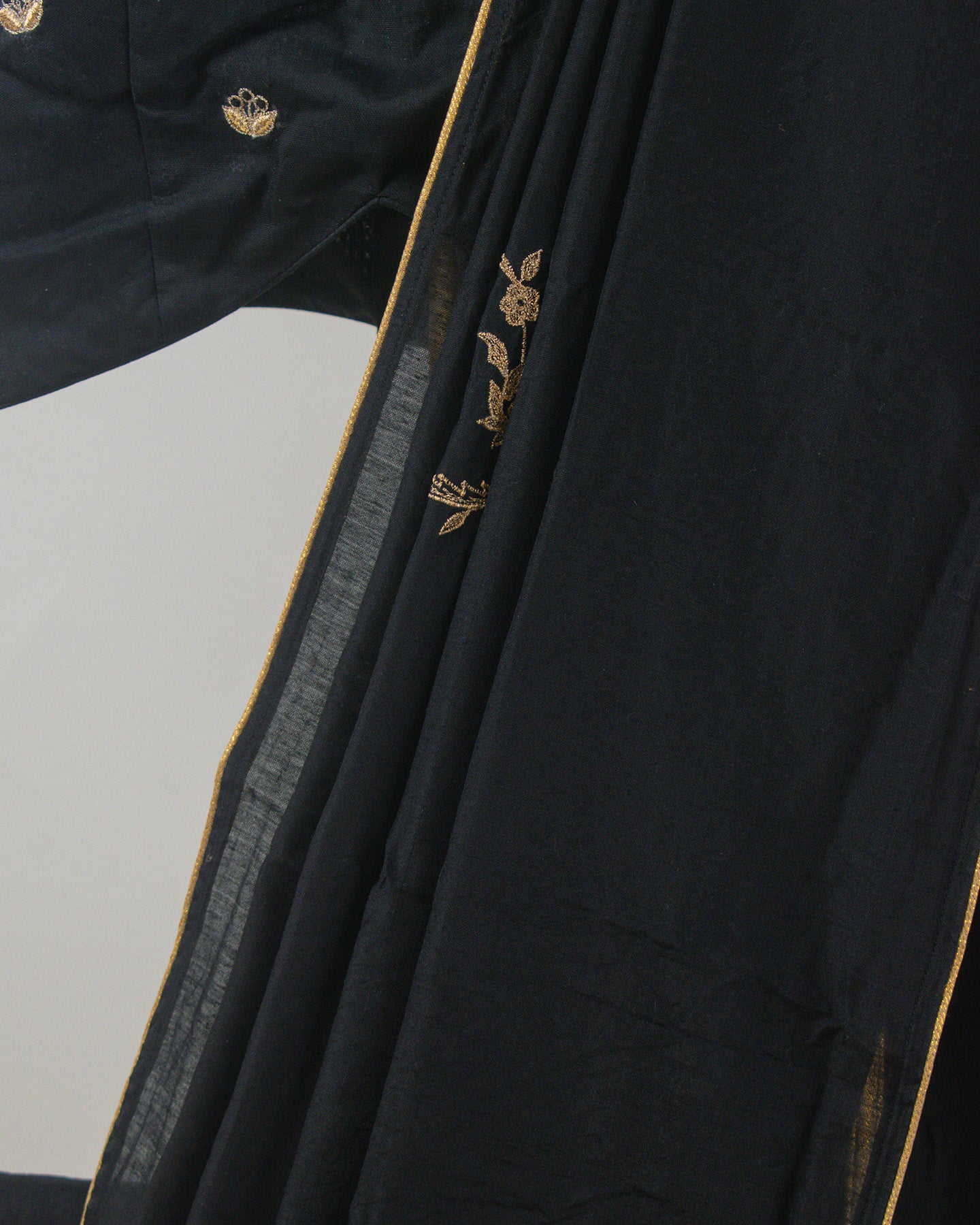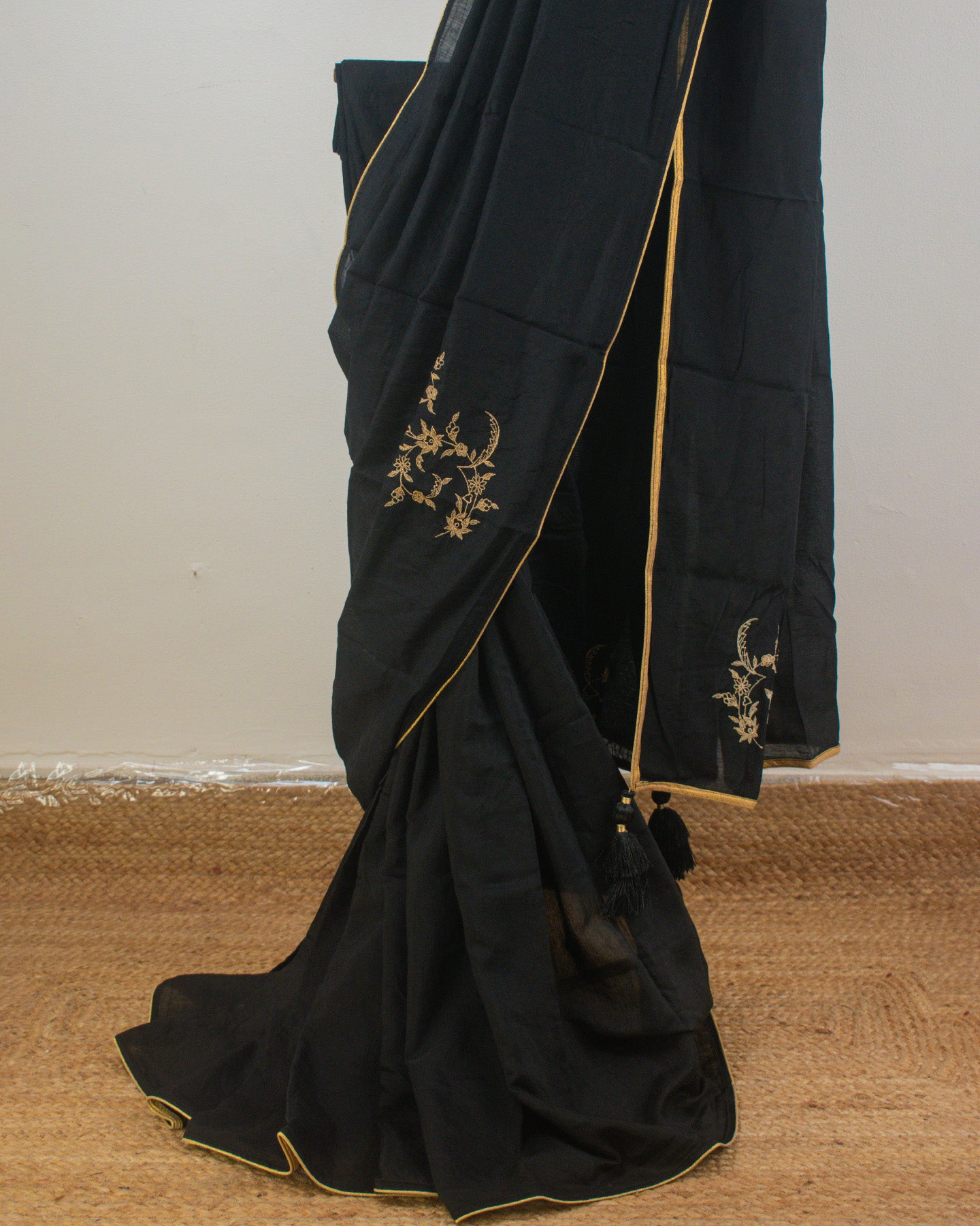 This elegant Black Chanderi Saree boasts a silky, buttery texture and is subtly enhanced with delicate lace edging. It features exquisite manual machine embroidery, adding a touch of refined artistry.