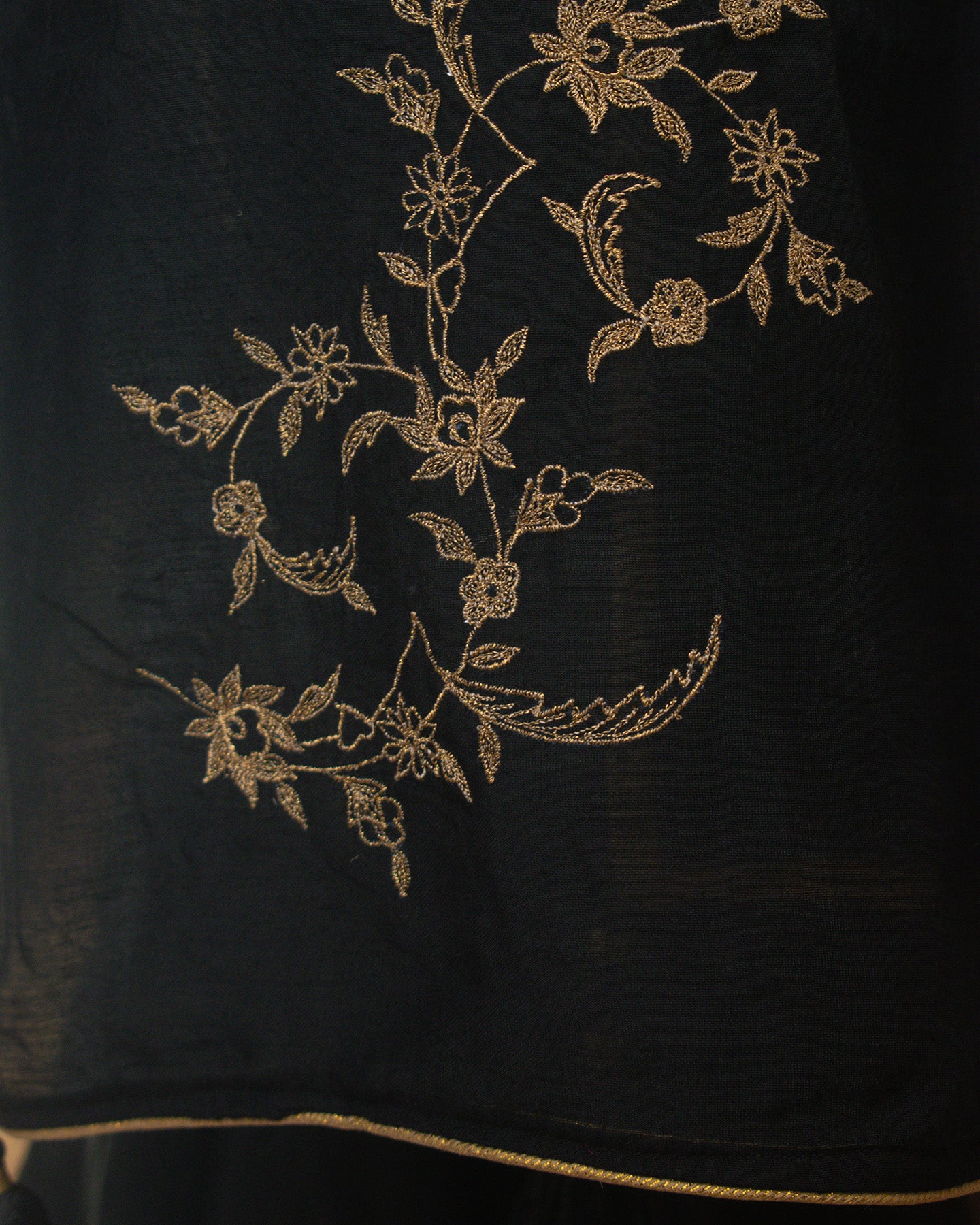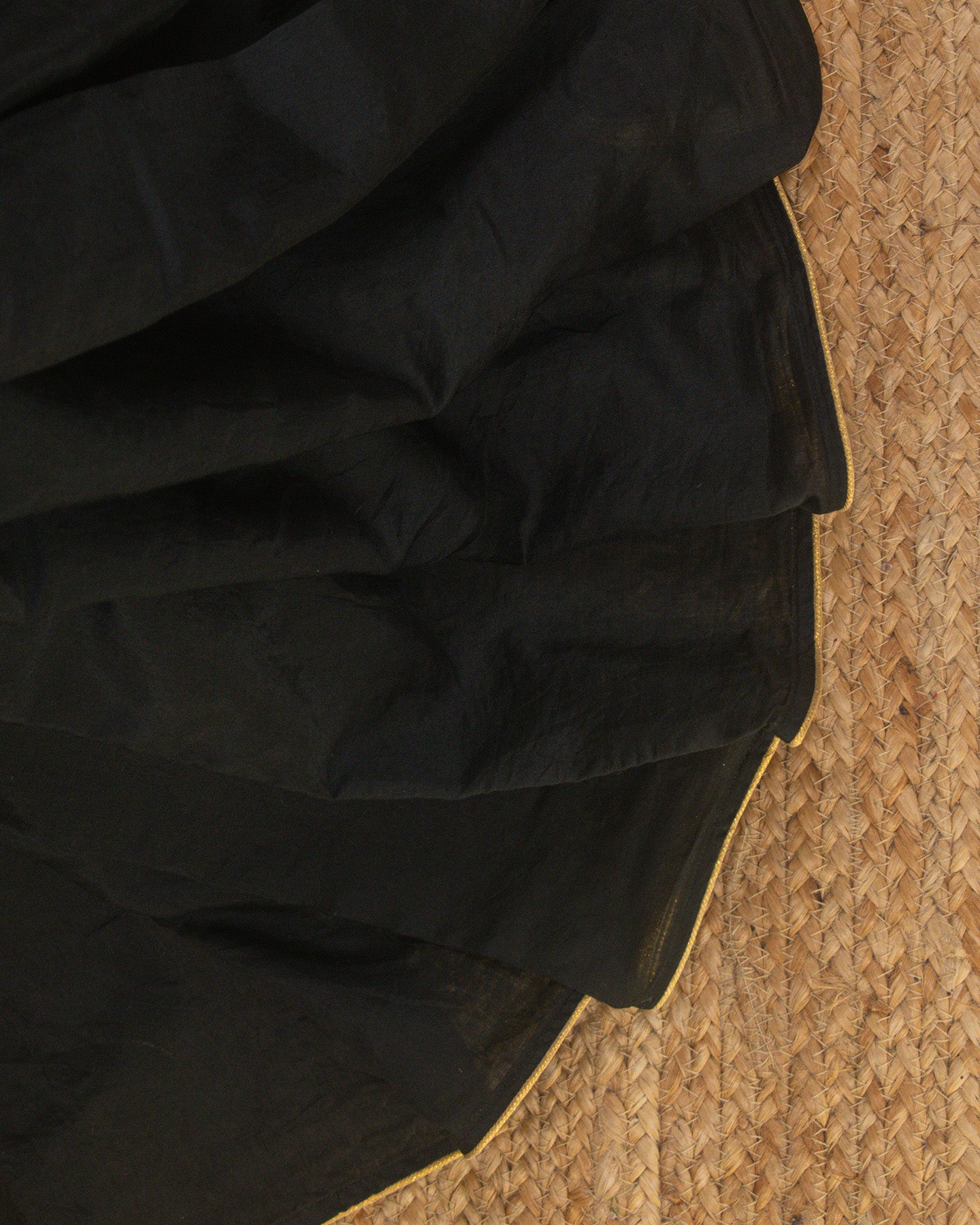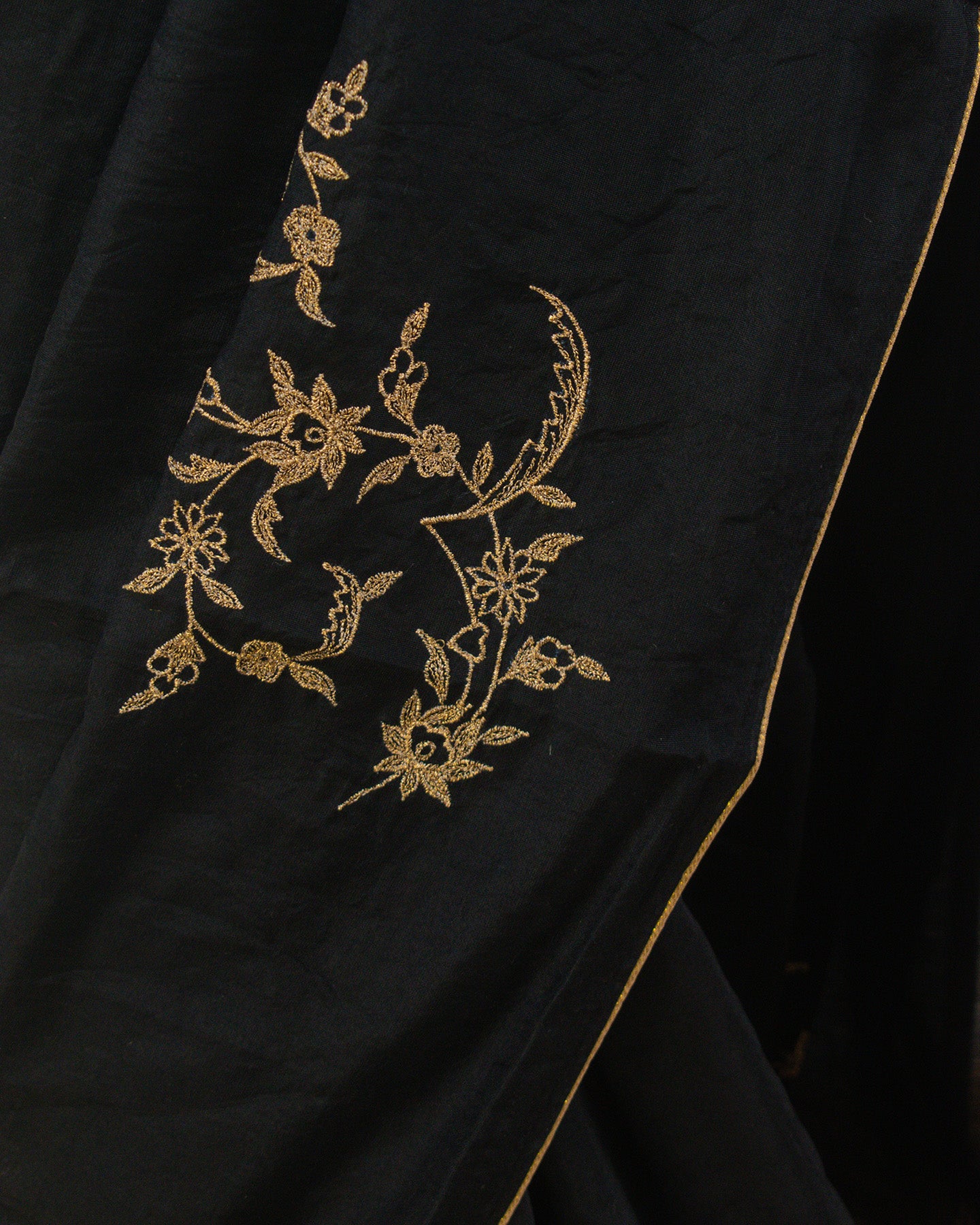 This elegant Black Chanderi Saree boasts a silky, buttery texture and is subtly enhanced with delicate lace edging. It features exquisite manual machine embroidery, adding a touch of refined artistry.