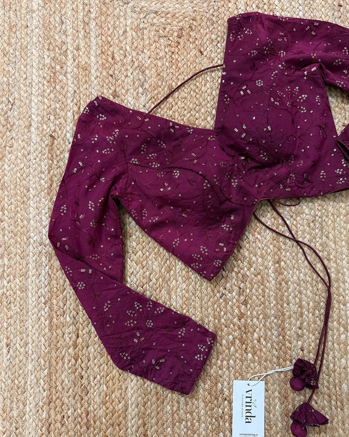 This beautiful wine blouse is a stunner, with comfort of pure cotton lining all over inside is perfect addition for your party-wear collection .