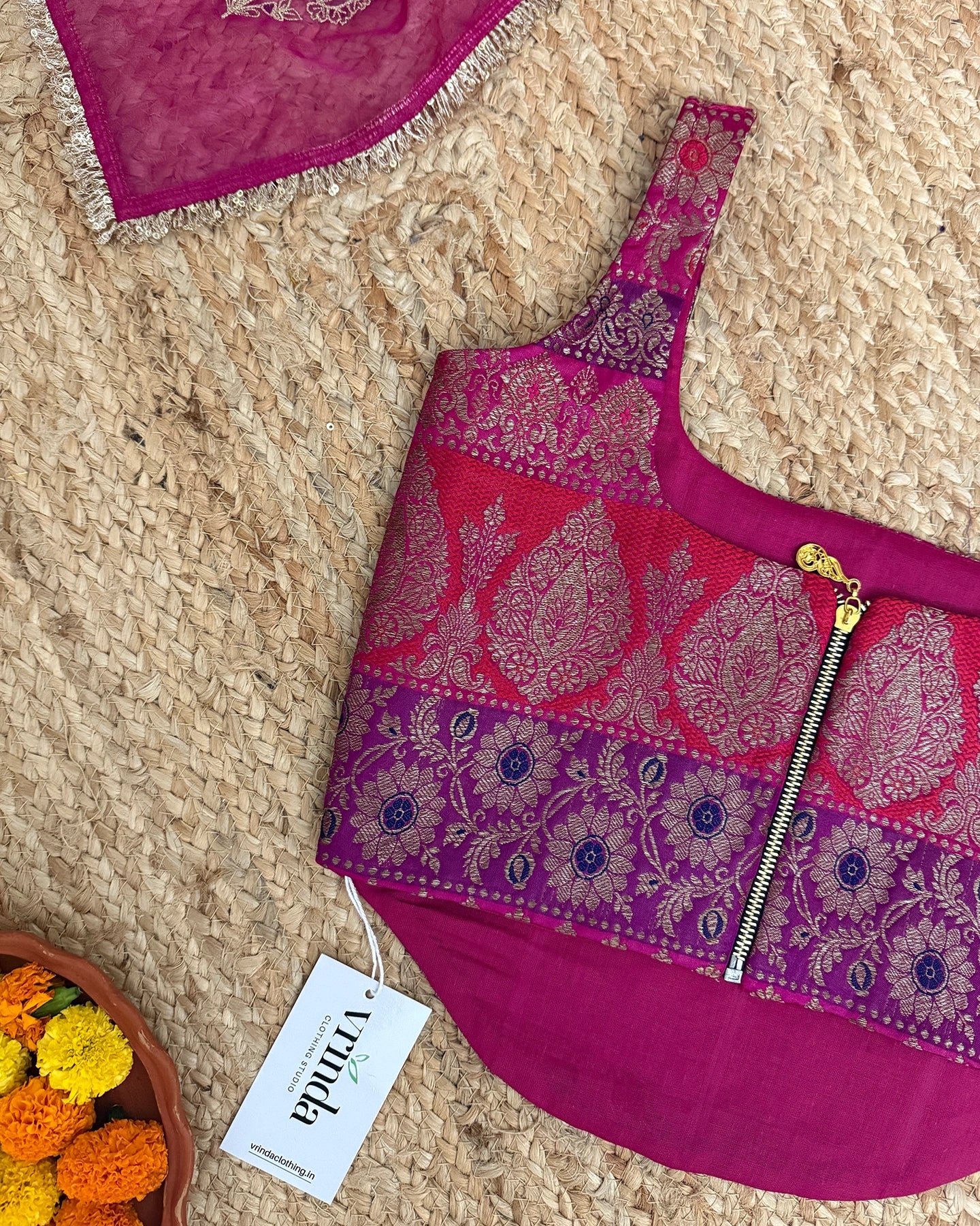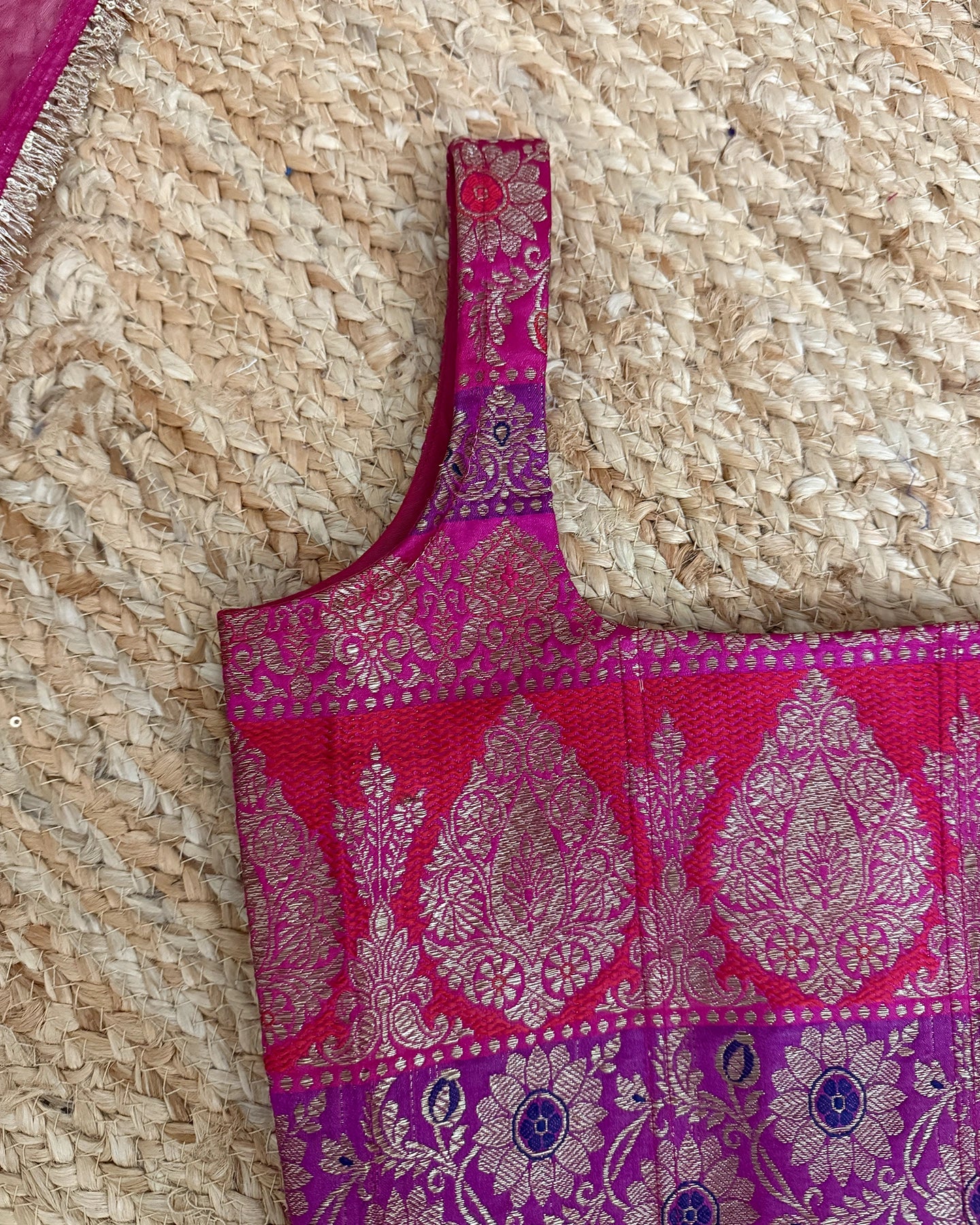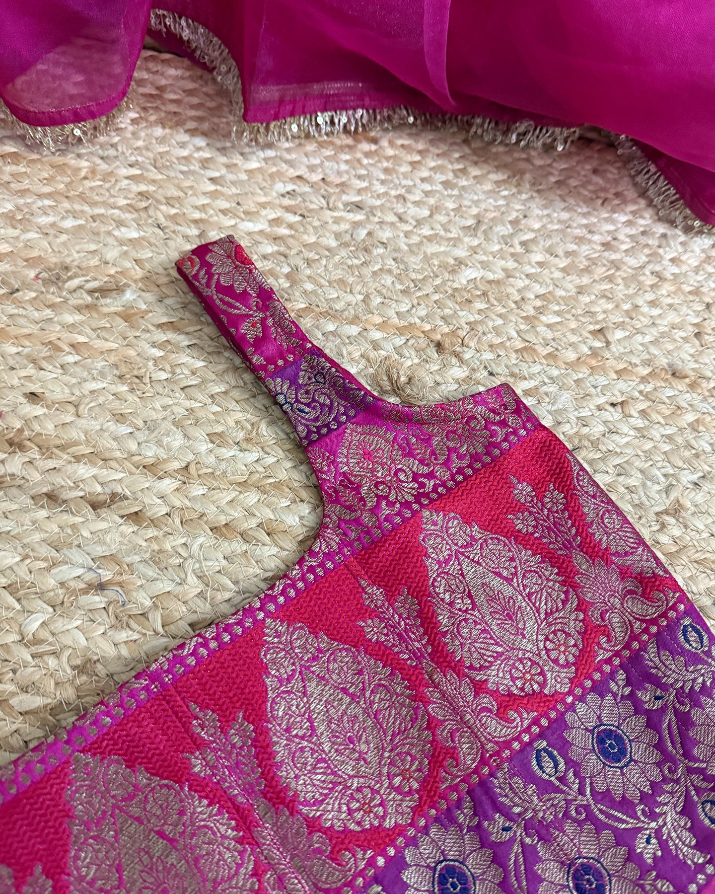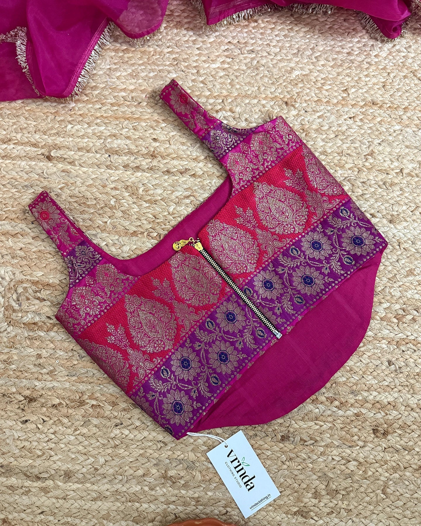 Made from Pure Varanasi silk , with pure cotton lining all over, this designer blouse emanates royalty. Date nights, special occasions or parties this saree corset a must have for your wardrobe.