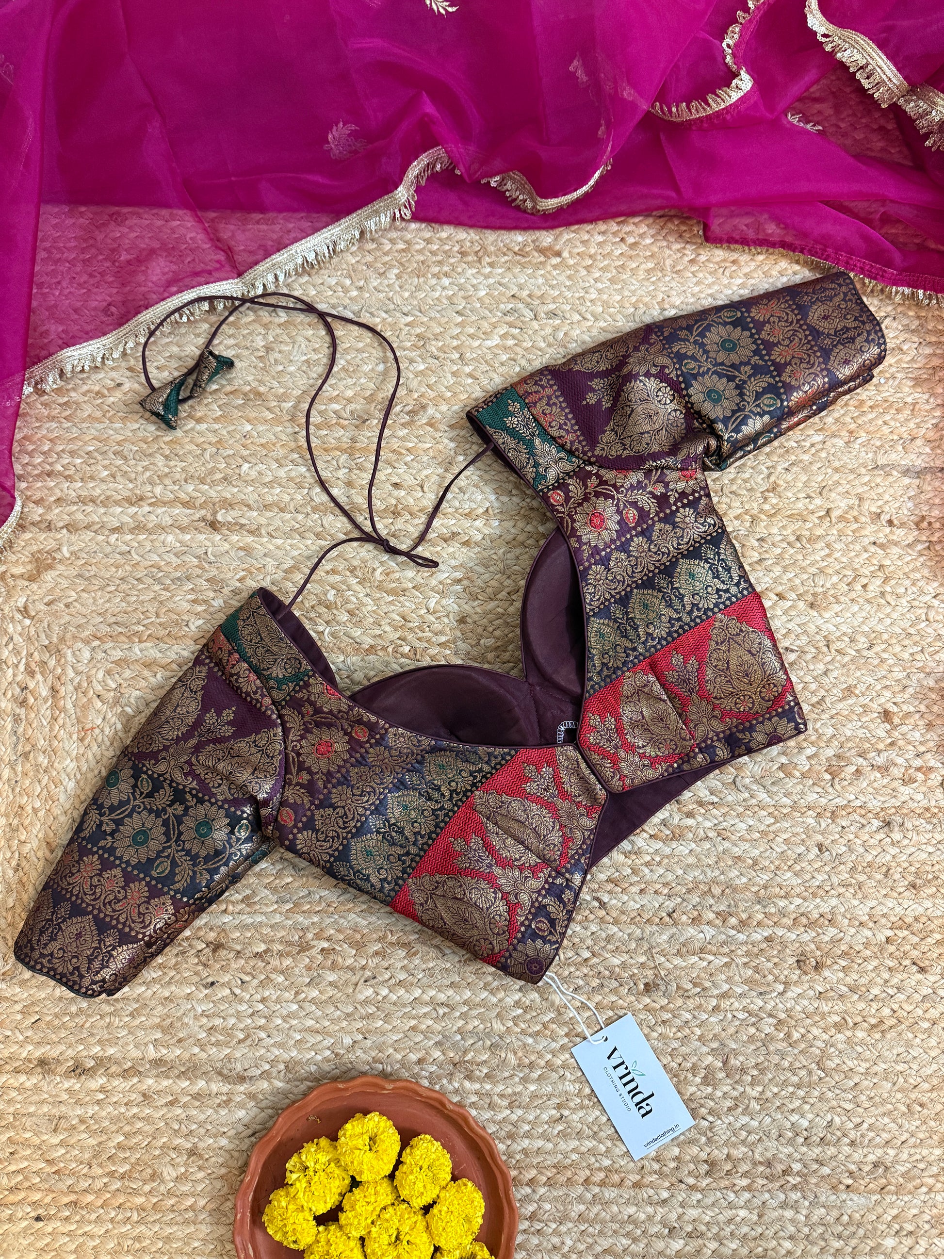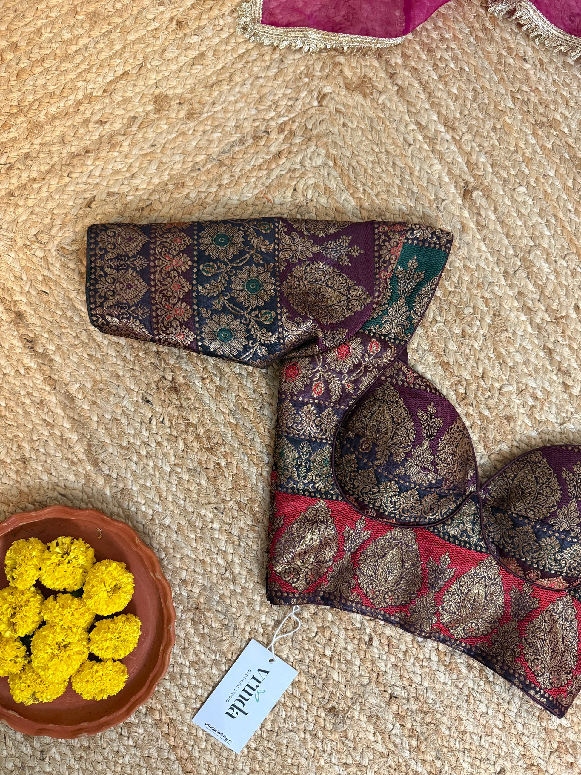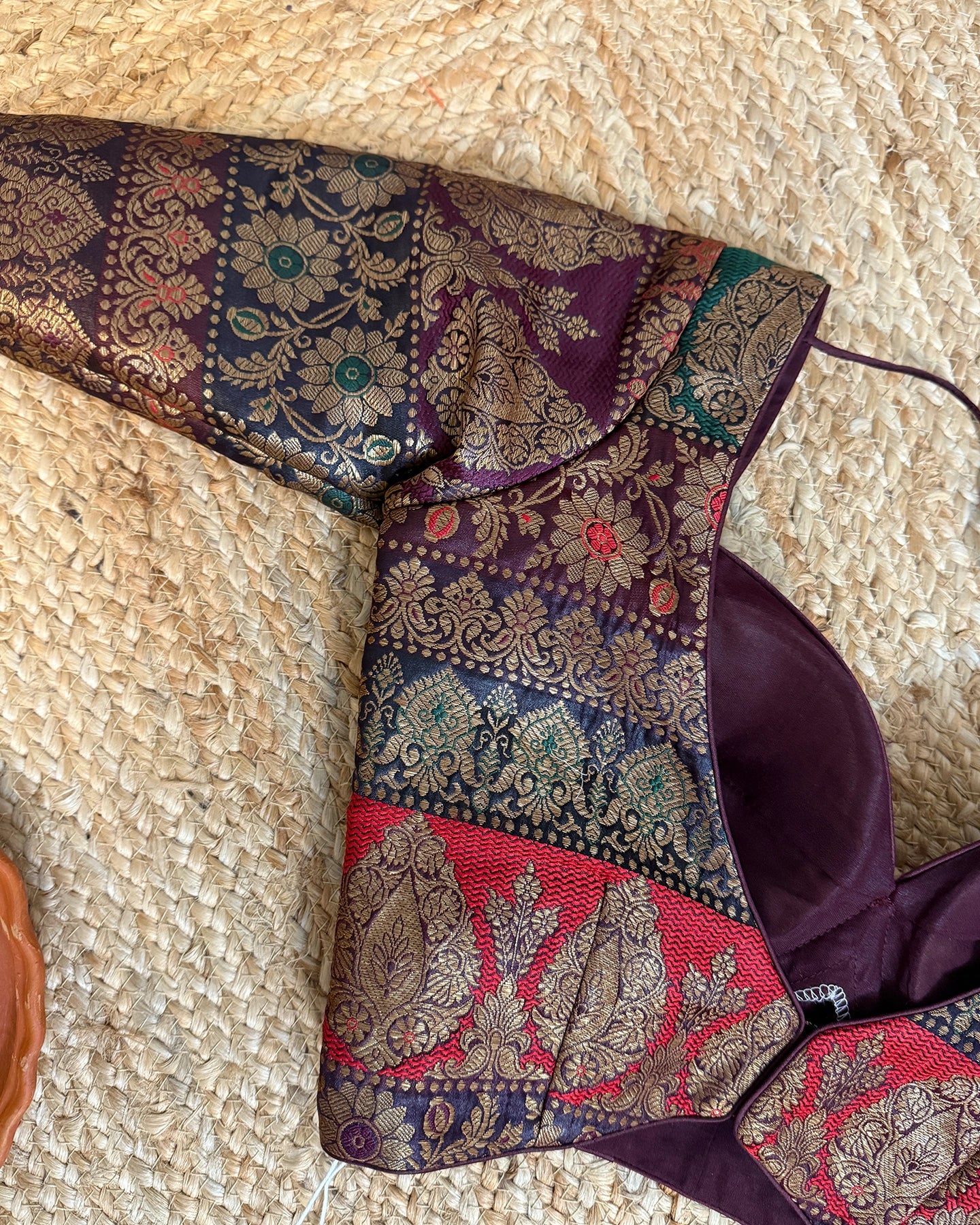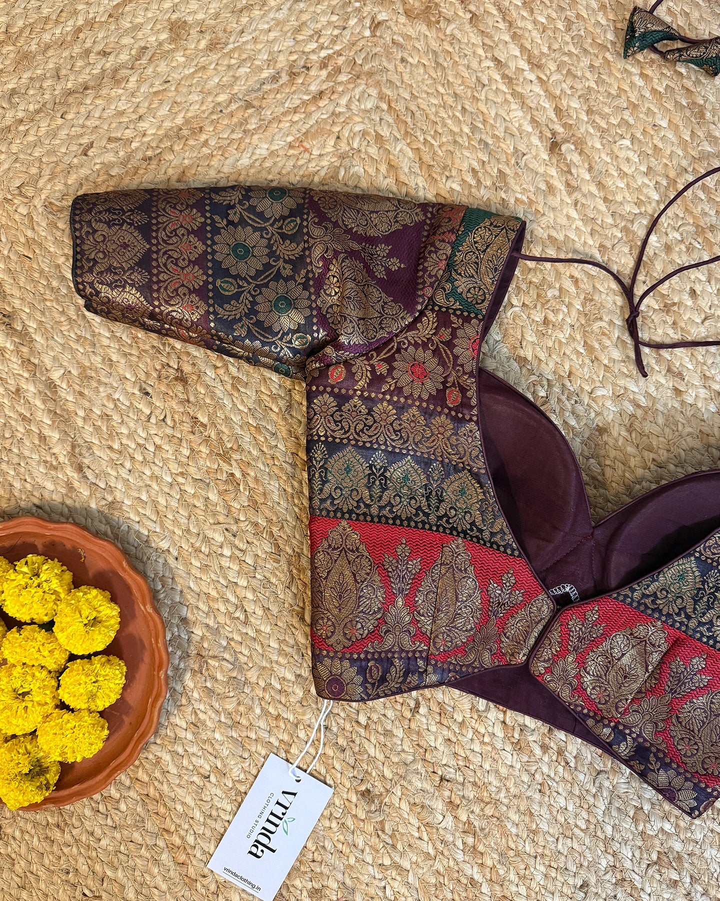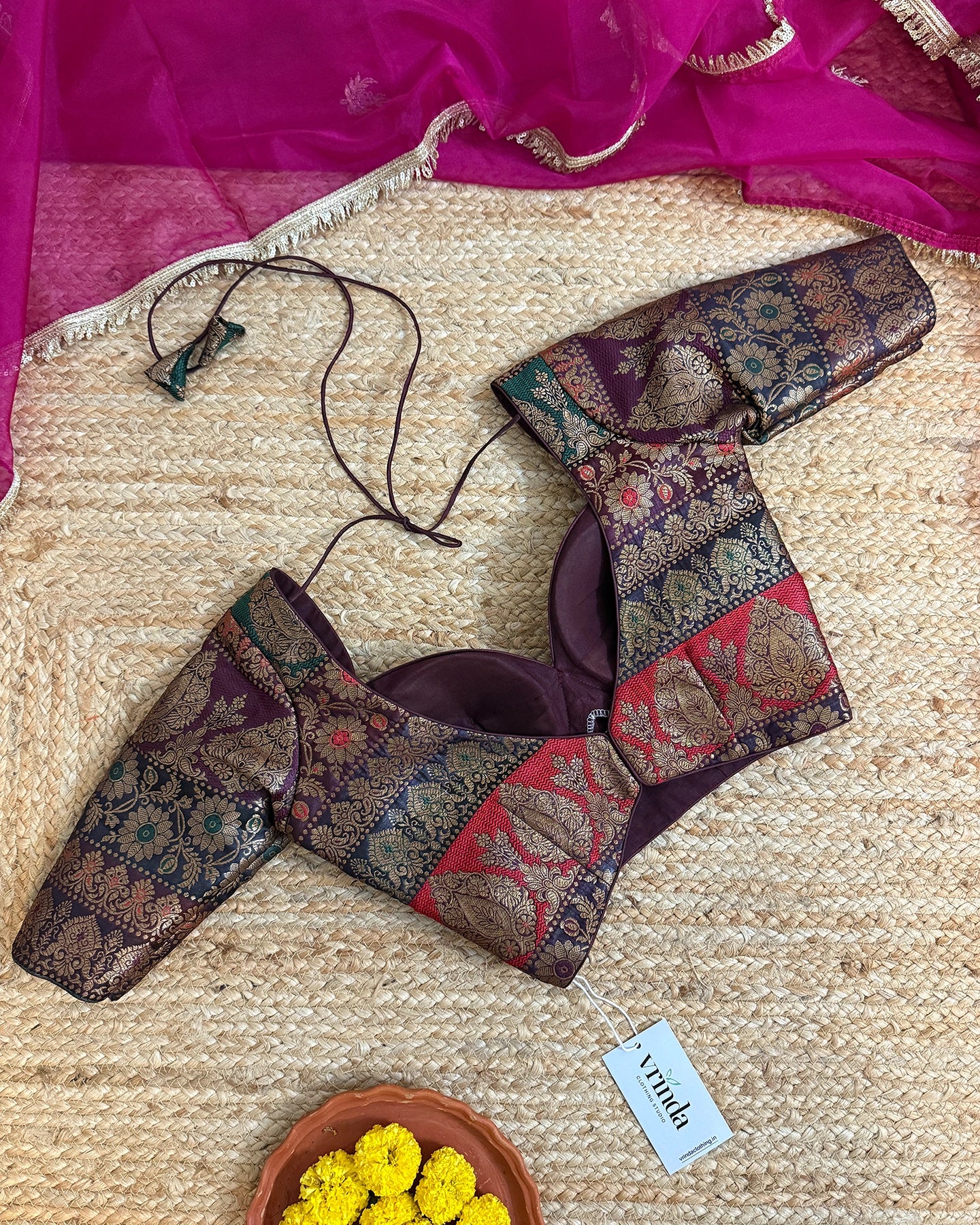 This blouse showcases exquisite Varanasi brocade silk craftsmanship, highlighted by delicate shoulder strings and a refined neckline for a graceful look.