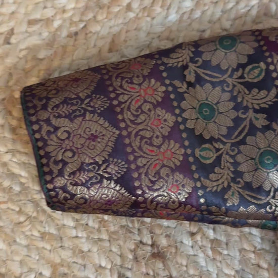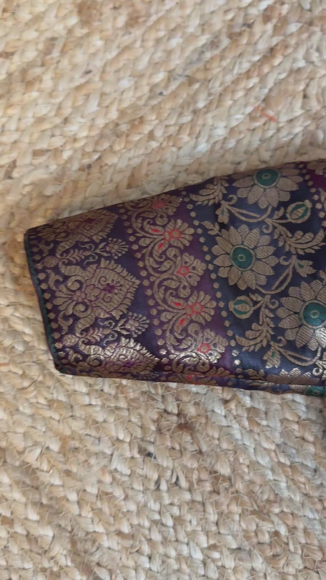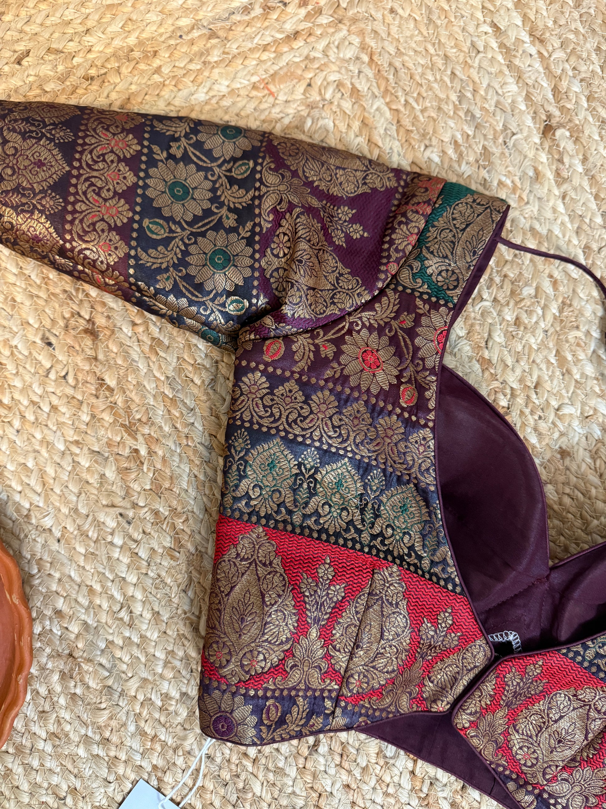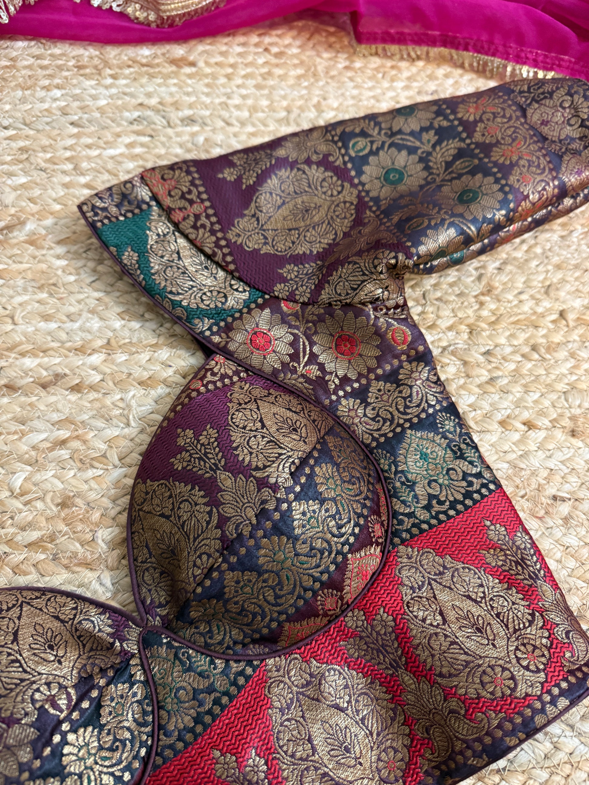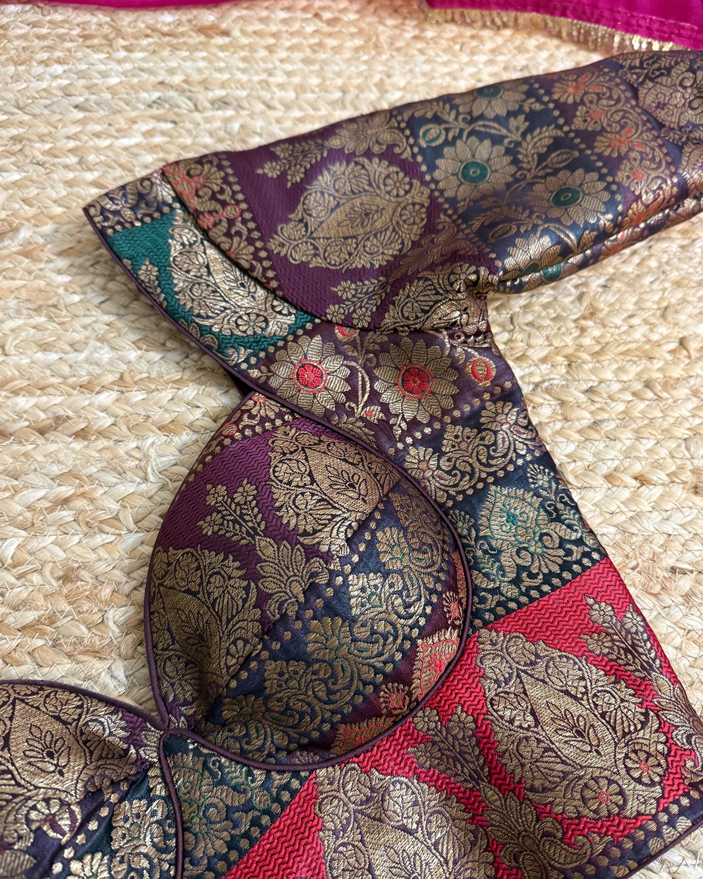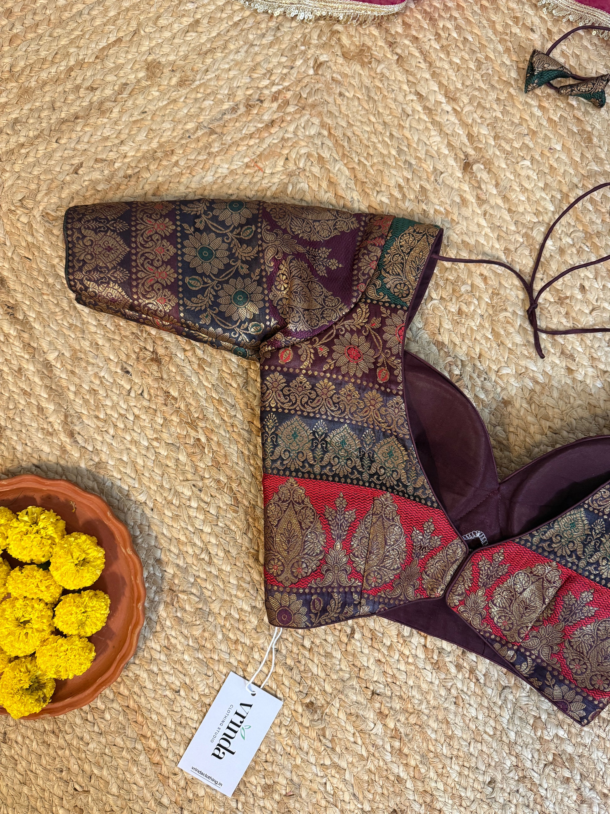 This blouse showcases exquisite Varanasi brocade silk craftsmanship, highlighted by delicate shoulder strings and a refined neckline for a graceful look.