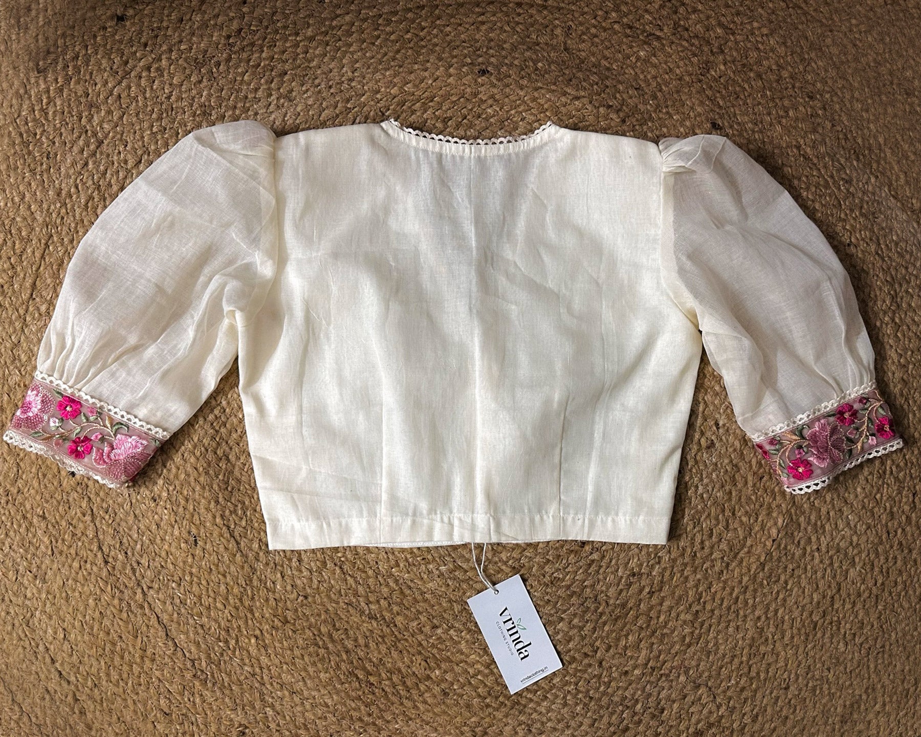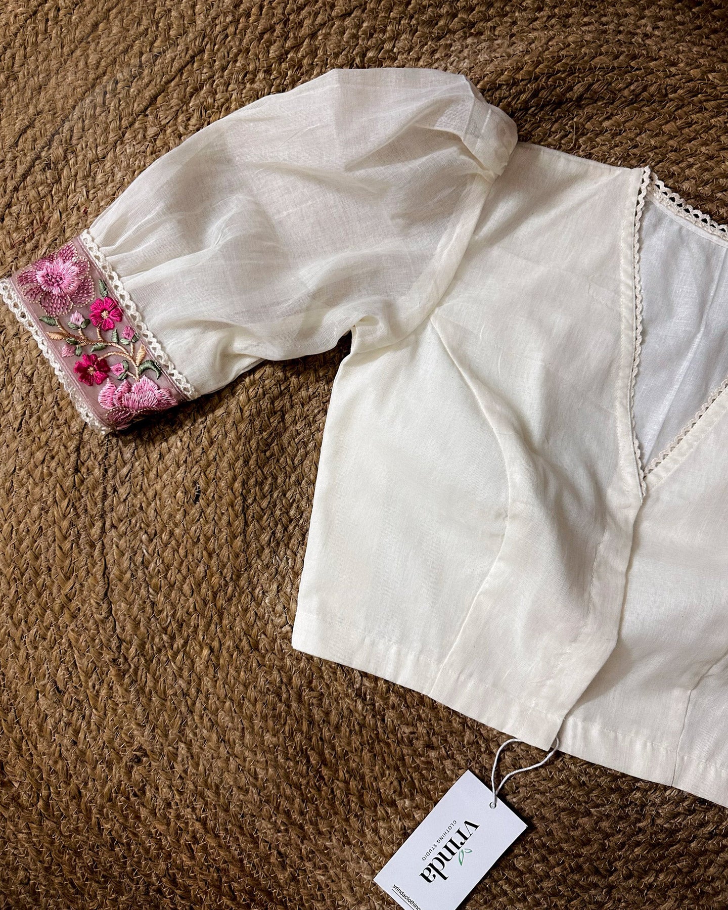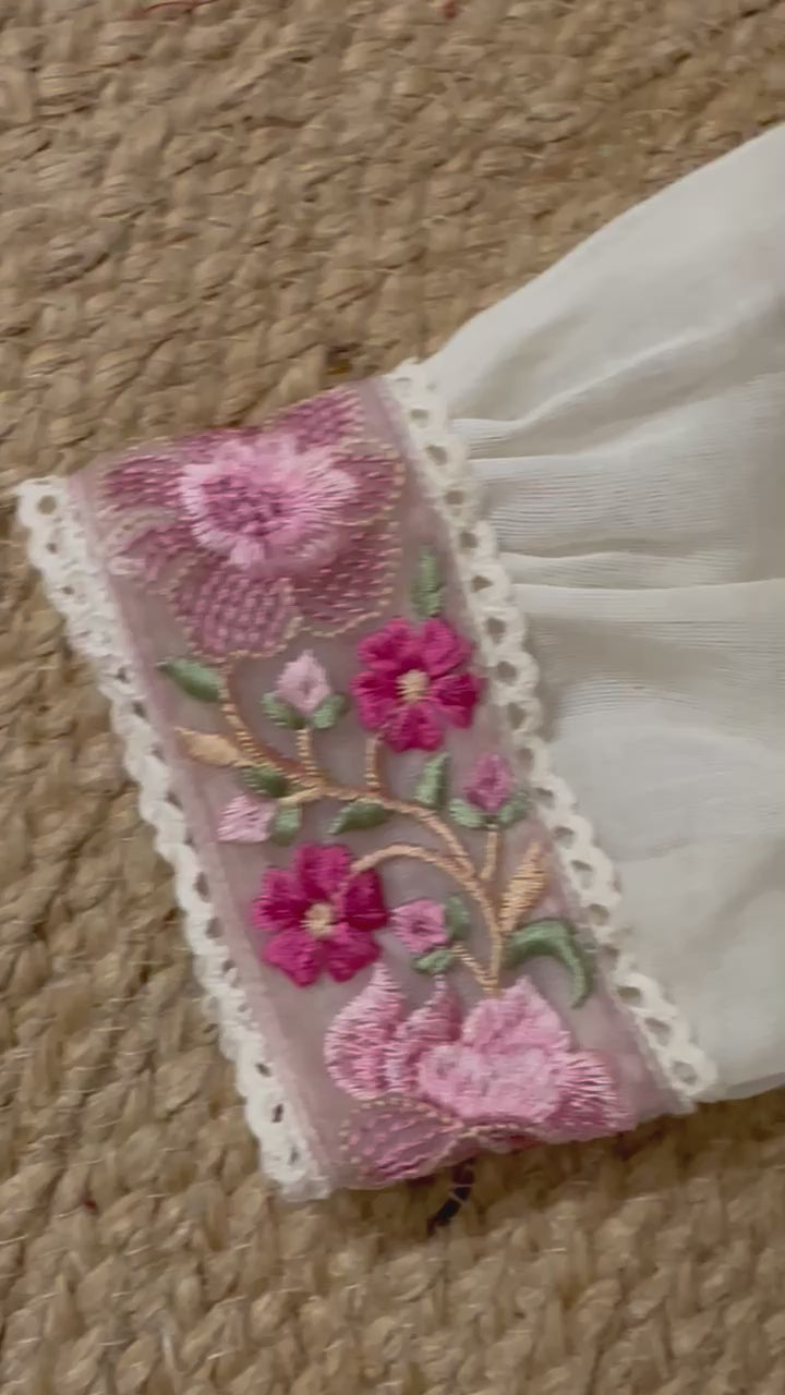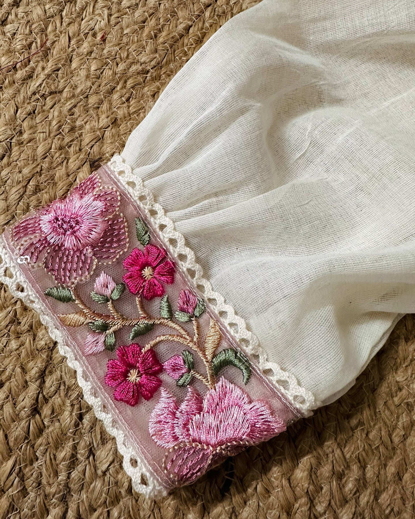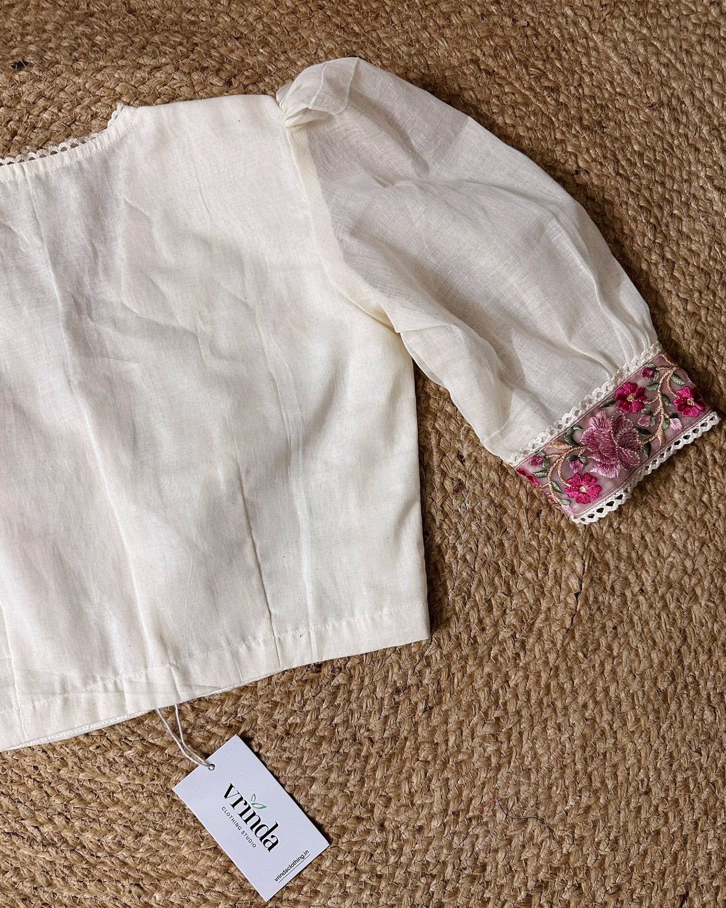 Mesmerisingly beautiful mulmul blouse with minimal lace edging and embroidered cuffs for the perfect classic vintage look! It has pure cotton lining all over inside.