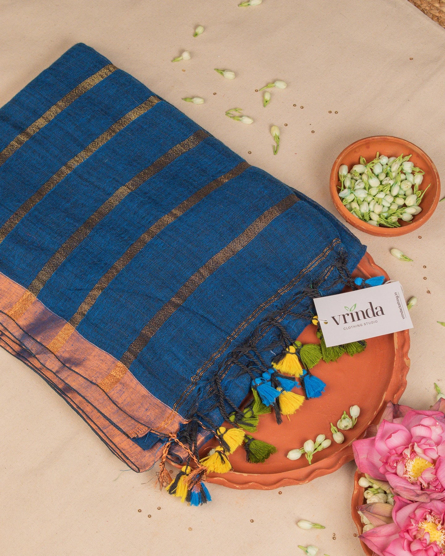 This delightful handwoven Linen Saree, adorned with lovely stripes, is airy and comfortable—perfect for adding a splash of joy to your celebrations and parties.