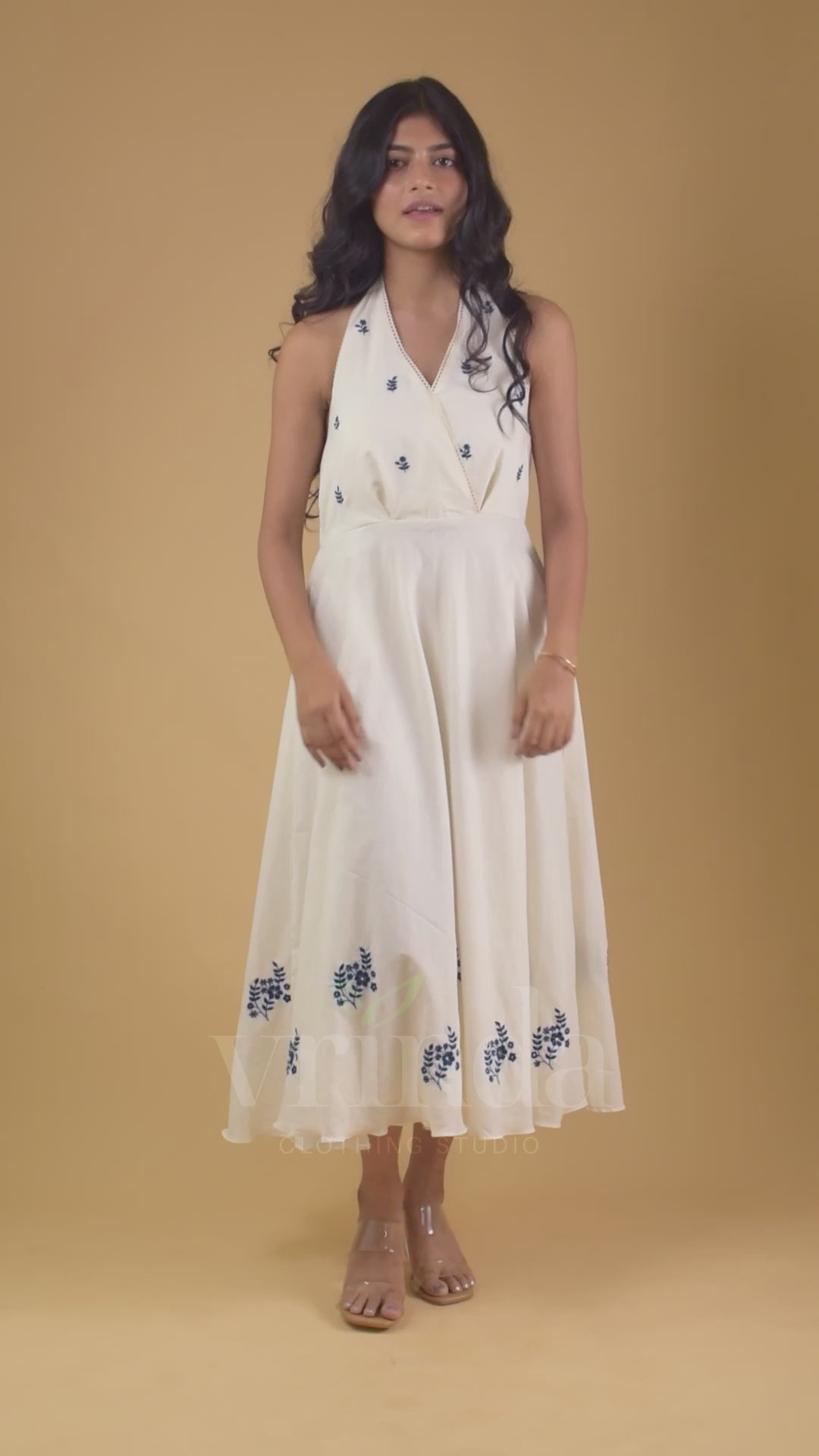 Fall head over heels for the Vanessa Dress! This showstopper features mesmerizing indigo floral embroidery. The halter neck adds a touch of sophistication and unbeatable ease.